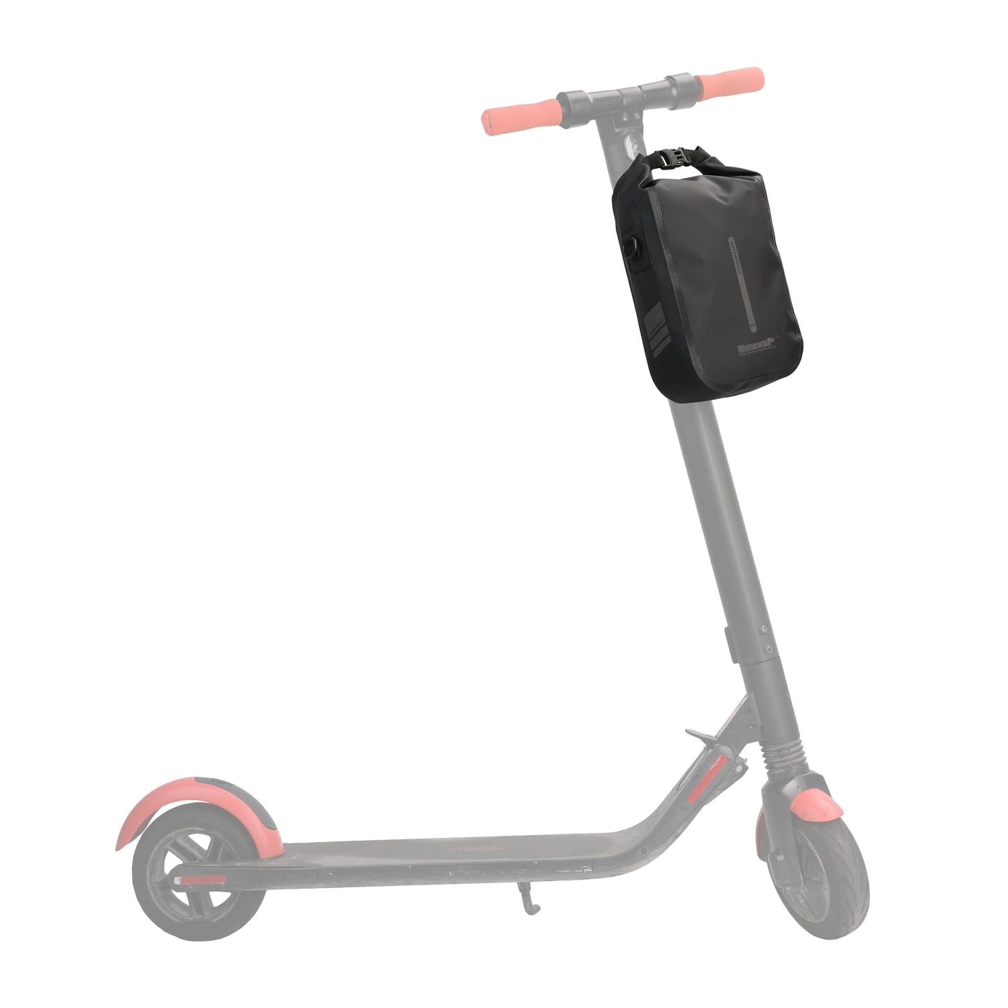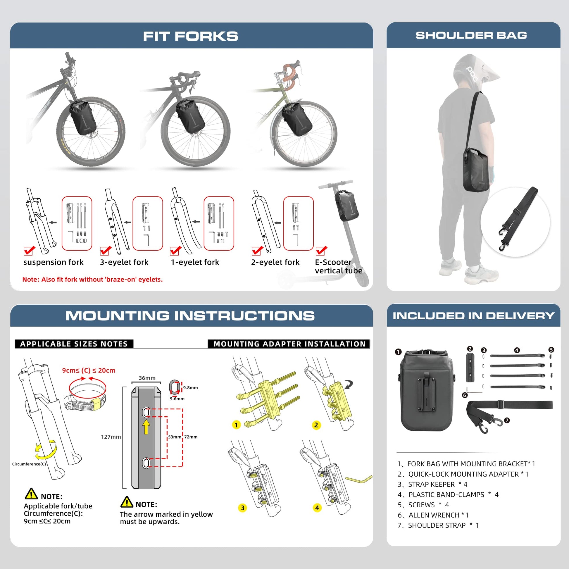 ["100% waterproof fabric and seamless welding process, can withstand heavy rain and splashes. Our inner nail hole is protected by an additional layer of waterproof material, preventing water from entering and keeping your gear dry. When the roll closure is properly rolled, the bag can meet standard IP64.","Quick assembly, high strength quick release and locking system (mounting bracket and adapter) to attach the bag to the fork or tube. Ultra-fast locking, with one click the bag snaps into place. Quick release, simply move the release lever and lift the bag up, so it can be quickly removed and used.","3-point attachment system using 3 adjustable strap clamps that can be locked with screws. And mounting brackets with 2 M5 screw holes, suitable for eyelet fork. It can also be mounted on forks without mounting holes.","Internal compartments for sorting. D ring on both sides, combined with the included shoulder straps, it can be used as a shoulder bag. Reflective logo print on both sides for better visibility at night.","Suitable for e-scooters, touring bikes, road bikes, mountain bikes. Can be used for commuting or outdoor activities."]