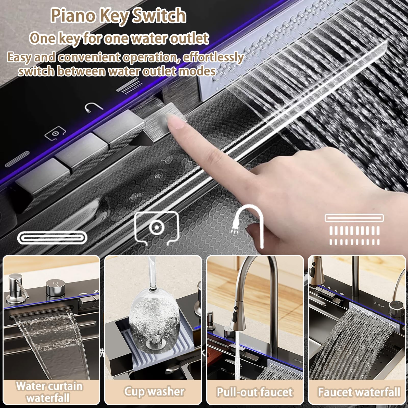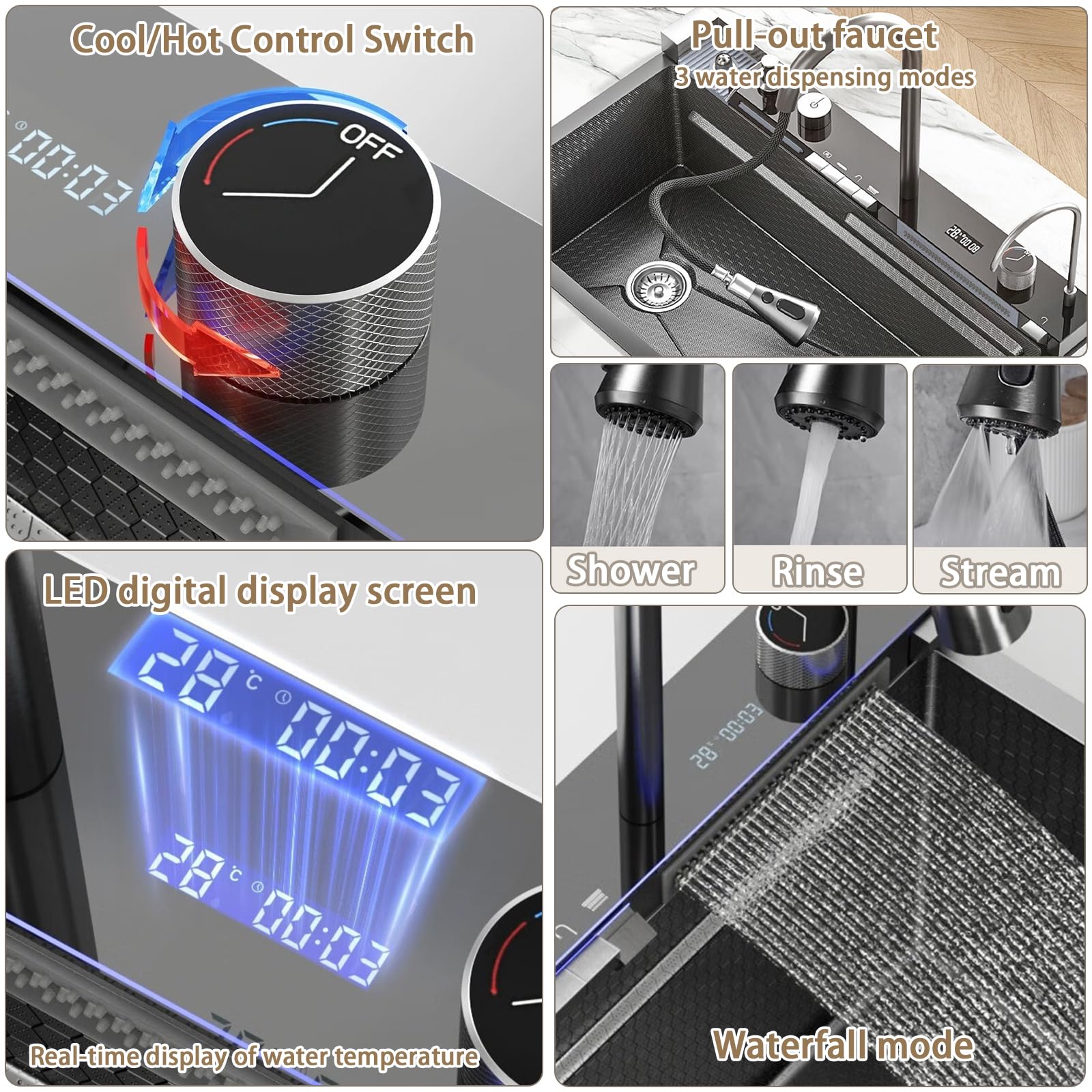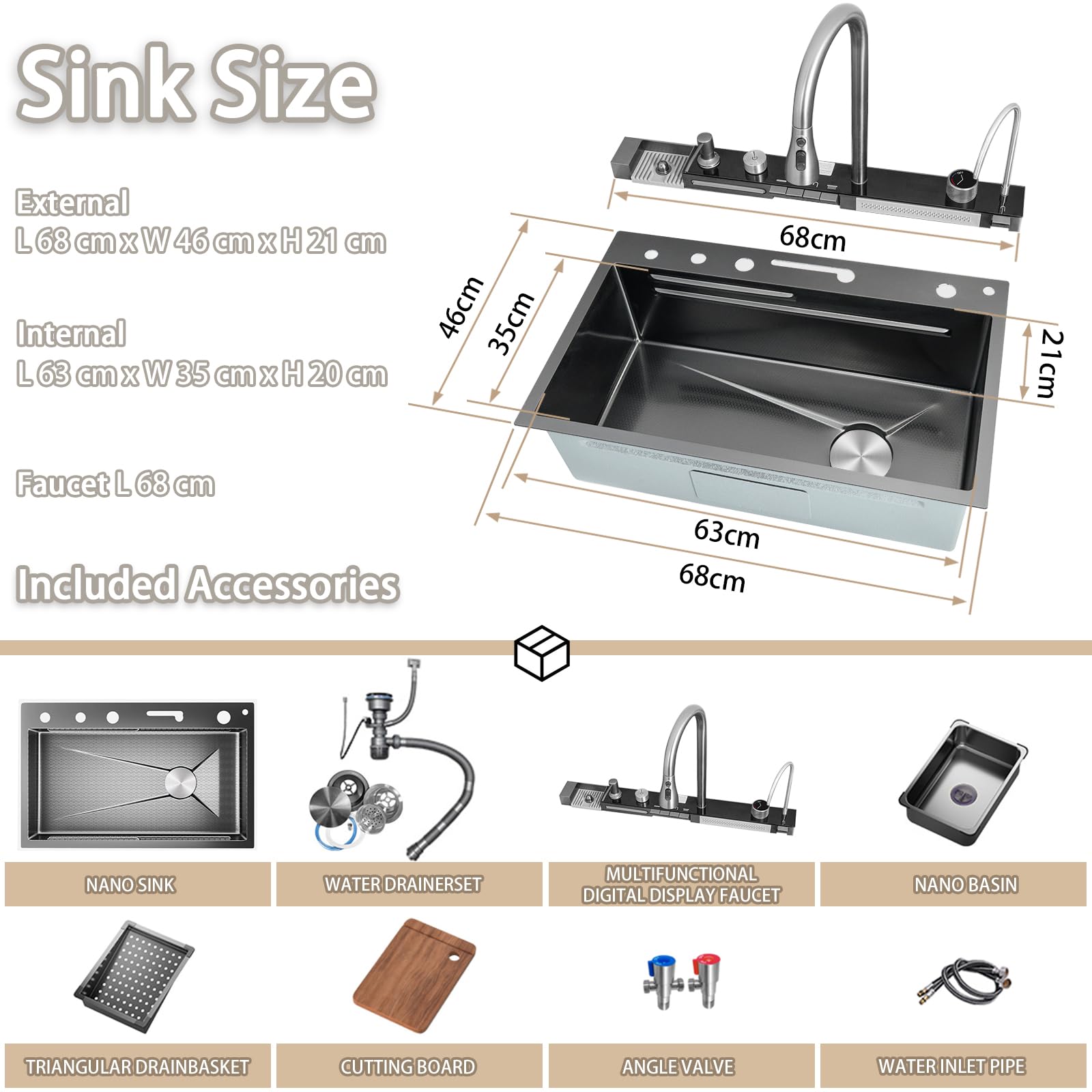 Ribanedy Multifunctional Digital Kitchen Sink, Waterfall Sink made of 304 Stainless Steel, with 5 Water Outlet Modes, Waterfall Pull-out Faucet, Cup Cleaner, and other sink accessories set (68 X 46 cm).