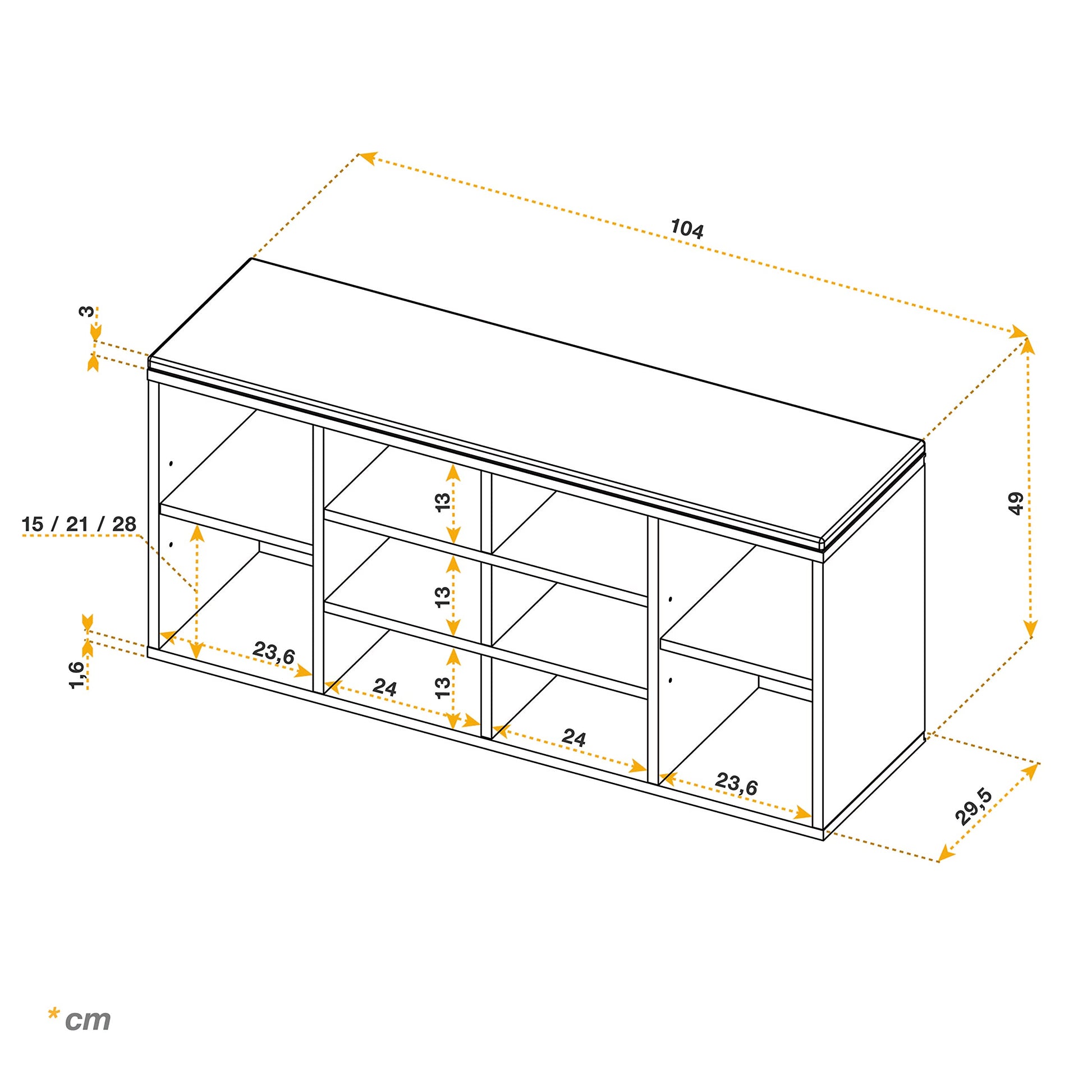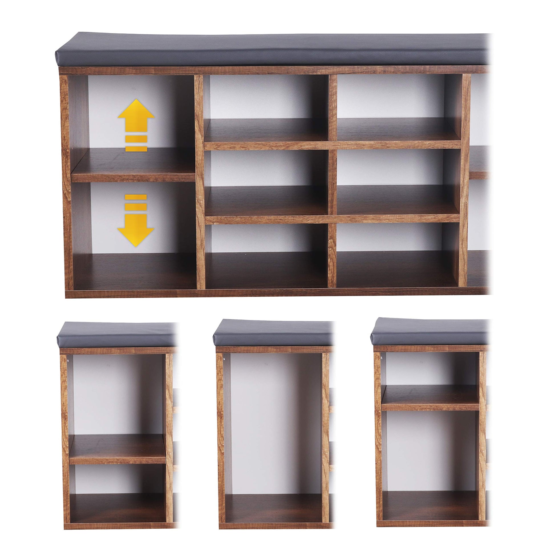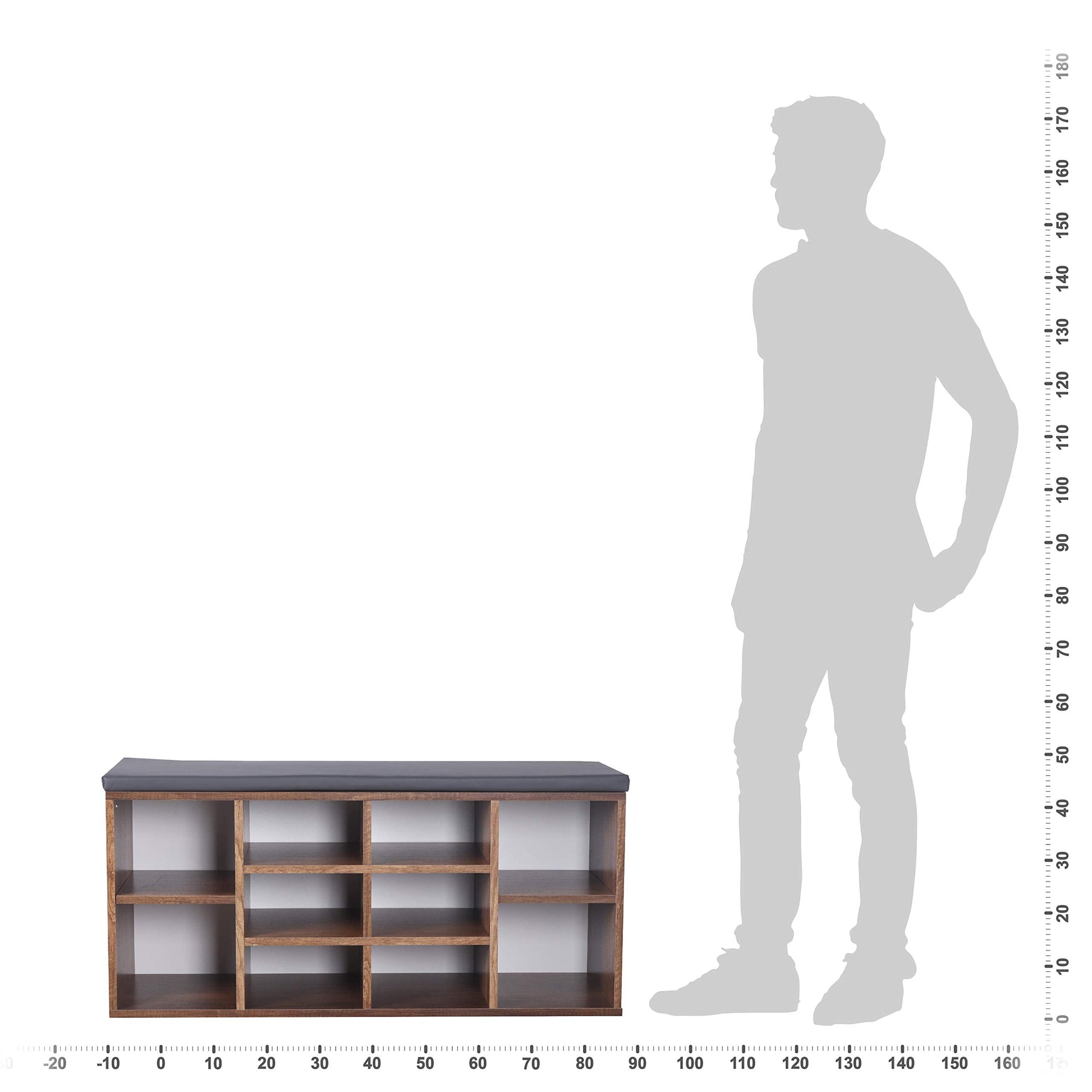 ["Description: This coat rack for stairwell dressing room or storage room has 10 open compartments as storage space and a seat cushion. The seat surface (Gray) is thickly padded and comfortable","Function: A hallway cabinet like this fits in with a wooden wardrobe. Our coat rack bench, dresser made of wood chipboard with seat cushion is a beautiful piece of furniture","Use: Thanks to plenty of storage space, this wooden bench is versatile. Space-saving and practical storage. The outer compartments of the shoe cabinet can be varied. The shelf insert on the left and right can be removed","Order: Store all your shoes in this shoe rack like winter shoes hiking sandals pumps sneakers boots flip flops high heels men's lace-up boots crocs loafers slippers slippers children's shoes men's shoes","❗ IMPORTANT: Durable shoe rack made of sturdy chipboard / No MDF or bamboo. Wooden furniture like this shoe cabinet for indoor use","0","0"]