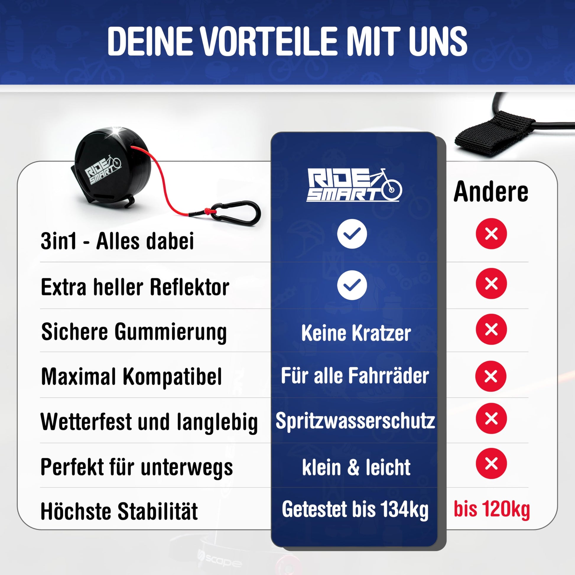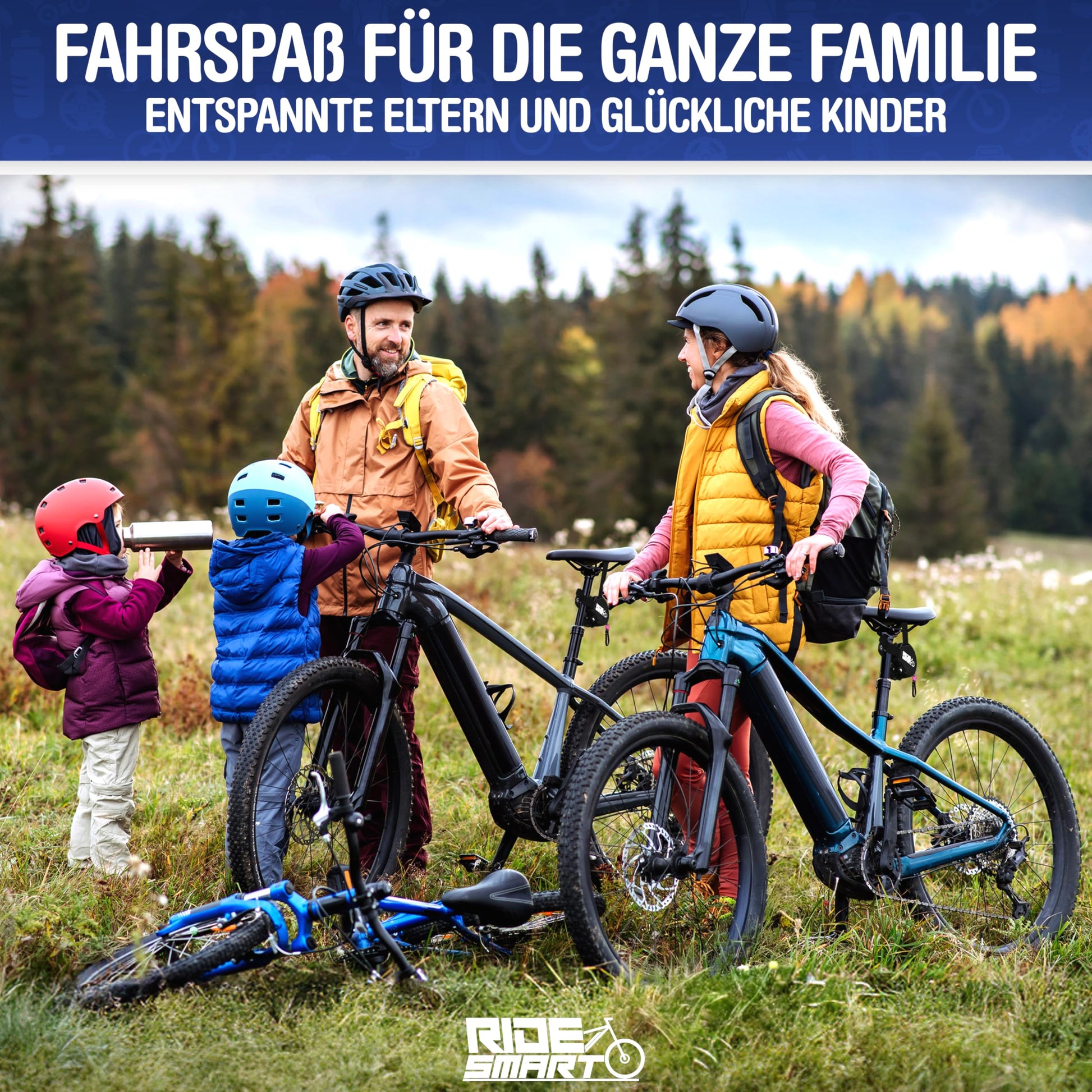 ["[3in1 Premium complete set] Our 3in1 solution combines a metal claw, a rubber-coated towing loop, and a carabiner - full flexibility in the use of the bicycle tow rope, bicycle cable, and towing rope on a bicycle!","[Maximum quality and product safety] Reflector & neon orange for best visibility in darkness. Automatic retraction mechanism keeps the rope taut. Rubber-coated metal claw and loop prevent scratches and slipping - the perfect bicycle tow rope for children's bicycles, e-bikes, and MTBs.","[Universally usable for all bicycles] The RIDE SMART tow rope fits all bicycles: whether children's bicycles, kids bikes, e-bikes, MTBs, or Woom bikes - it is the ideal MTB accessory, bicycle learning aid, or MTB gadget for every model. Super towing rope for children's bicycles and accessories for children's bicycles.","[130 kg tensile strength] With a tensile strength of 130 kg, the tow rope is robust and suitable for daily towing operations on bicycles with children. Ideal for towing e-bike children's bicycles, e-bikes, and mountain bikes or as a bicycle pulling aid for children. For family adventures without compromises with our bicycle tow rope, towing rope for children.","[RIDE SMART] offers high-quality tow ropes for bicycles, specially designed for safe towing of children's bicycles. Our bicycle cable pull for children combines functionality and safety - ideal for any towing system. Whether a bicycle tow rope for children, cable pull for children's bicycles, or general bicycle accessories - our premium accessories make every bike ride safer and more comfortable. Trust RIDE SMART when it comes to reliable bicycle accessories for families!"]