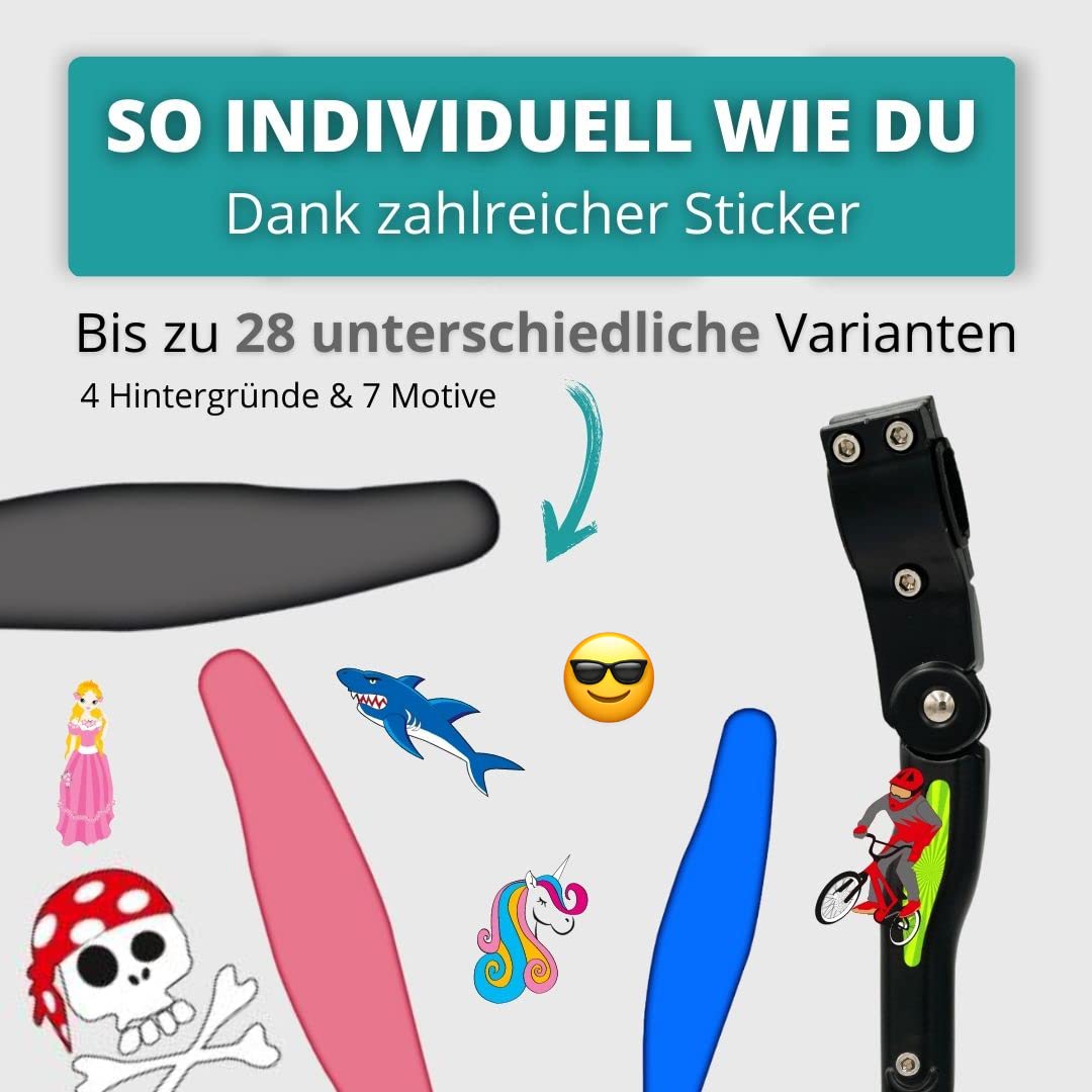 ["Perfect length - The bike stand fits perfectly on all bikes from 20 to 24 inches with its newly developed and shortened foot.","FOR ALL BIKES - The bike stand is universally usable and fits on all common chainstays (rectangular, oval or round), the included Gripsheet ensures a secure hold of the stand on the bike.","FOOT WITH 3D STRUCTURE - The innovative foot of the kids' bike stand has a 3D structure for significantly better grip when parking on a slope, e.g. on a mountain.","SPACE-SAVING - The kids' bike stand has an optimal standing angle of 8-10° thanks to its improved bend, allowing space-saving parking and preventing the bike from tipping over.","CUSTOMIZABLE - The bike stand for kids' bikes is customizable with stickers featuring 7 motifs and 4 backgrounds (up to 28 variations) - a special highlight for kids."]