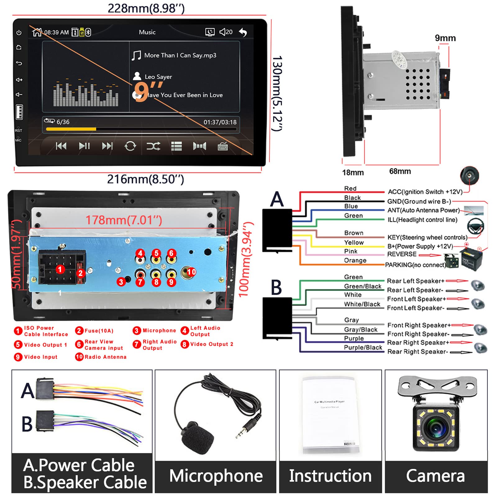 "1️⃣【9 Inch Touchscreen Car Radio 1 Din】The dimensions of this 9-inch car radio 1 Din are: 7.01 inches * 1.97 inches. 9-inch HD touchscreen, detachable screen. The AUX audio input interface supports external MP3 files, mobile phones, music players, etc. 9-inch car radio supports USB/TF/AUX/EQ. Supports multiple languages.