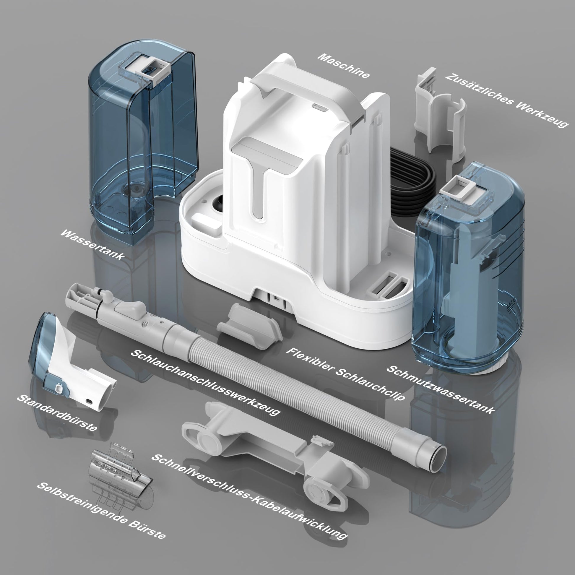 ["Upholstery cleaner device: The wet vacuum upholstery cleaner combines spraying, brushing, and suction functions for effective stain removal and effortlessly removes stains and dirt from a variety of surfaces, simplifying your cleaning tasks.","Within reach: With a 1.2-meter hose and a 5-meter power cord, the carpet cleaner upholstery cleaner provides a larger cleaning range, allowing you to clean hard-to-reach areas more easily.","Versatile cleaning for a variety of surfaces: The carpet cleaner wet vacuum is designed for use on carpets, sofas, stairs, and car interiors, thoroughly cleaning a variety of surfaces.","Two tanks: The sofa cleaner device has a large 1800ml tank for clean water and a 600ml tank for dirty water, separating clean water from dirty water for effective cleaning and easy maintenance.","Compact and lightweight design: Weighing only 3.84 kg, the wet vacuum car upholstery cleaner is light, easy to store, and has a user-friendly interface that allows even beginners to operate it."]