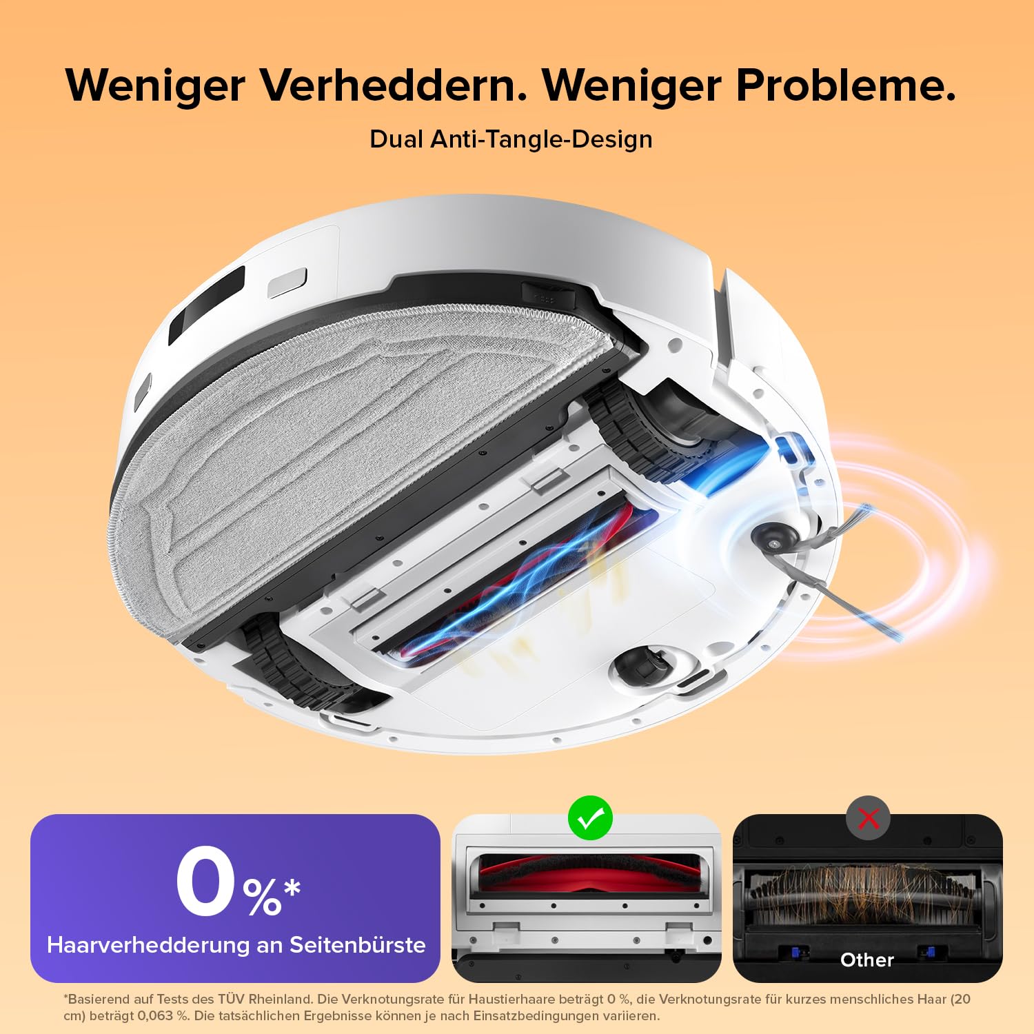 ["HyperForce suction power: With an impressive suction power of 10,000 Pa, this powerful system is capable of removing hair and dirt from floor crevices and deep in carpets.","Dual Anti-Tangle Design: Equipped with a JawScrapers Comb Anti-Tangle main brush and an Anti-Tangle side brush, this advanced system ensures smoother operation and less maintenance.","Auto-Lifting Mopping System: The Auto-Lifting Mopping System automatically adjusts to carpets for effortless and thorough cleaning. Enjoy efficient, effortless mopping for consistently flawless results.","VibraRise 2.0 Mopping System: The VibraRise 2.0 Vibration Mopping System utilizes advanced vibration technology to easily remove stubborn stains. It efficiently removes tough dirt and grime, leaving your floors pristine.","PreciSense LiDAR Navigation: The LiDAR-based navigation system scans 360° and simultaneously creates detailed maps for the most efficient route navigation. It also saves multiple maps for multiple floors.","Reactive Tech Obstacle Avoidance: This advanced system, powered by structured light, effortlessly detects obstacles and navigates around them, even in cluttered rooms with scattered items on the floor.","No-Go Zones: Avoid interruptions with intelligent navigation that recognizes sensitive areas like under chairs and tables, automatically suggesting No-Go Zones for smooth cleaning process.","Note: 2.4GHz Wi-Fi required for app connection."]