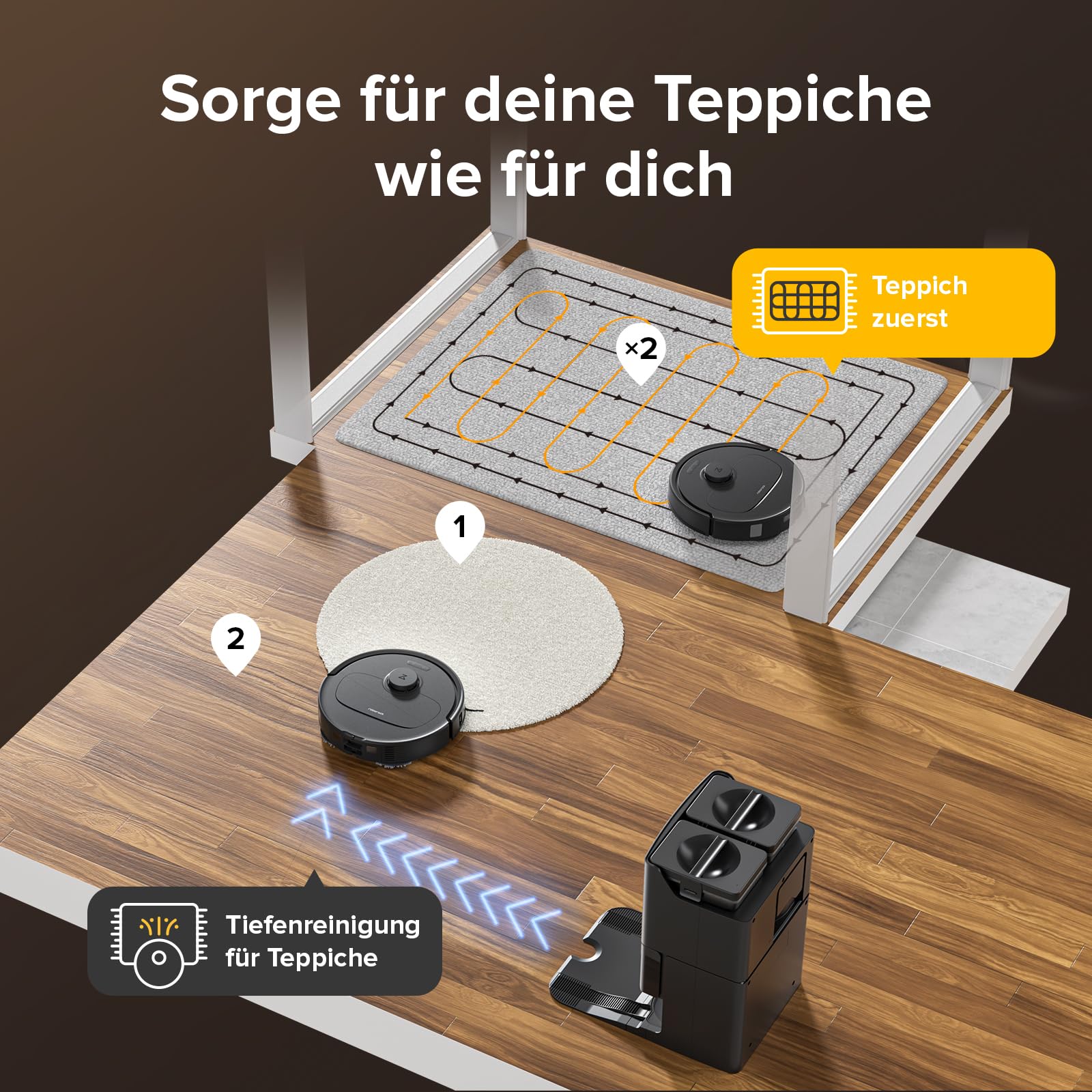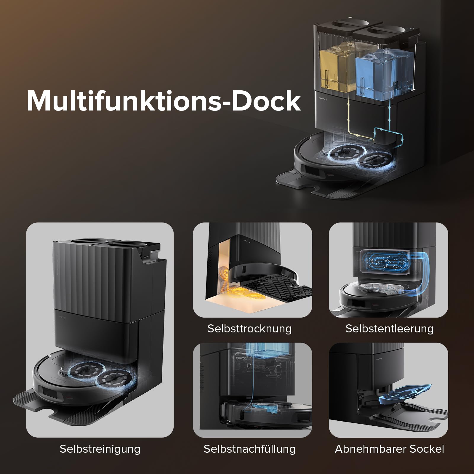 ["Powerful 7000Pa suction: With an impressive suction power of 7000Pa, it efficiently picks up pet hair and removes dirt and debris from carpets and hard floors for a flawless result.","10mm Auto Mop lifting function: Features a convenient 10mm Auto Mop lifting function that allows for a seamless transition between vacuuming carpets and mopping floors without worrying about the mop getting carpets wet.","Dual-spin mops for stubborn stain removal: The rotation speed of 200 rotations per minute and the 30-level water flow adjustment ensure thorough and efficient mopping, leaving your floors shining with each pass.","Multifunctional dock: Automatically empties and washes the robot so you can focus on the essentials. (Self-washing/self-drying/self-emptying/self-replenishing/removable base)","Reactive technical obstacle avoidance: Navigates with precision and care around furniture, walls, and other obstacles. Say goodbye to collisions and interruptions during cleaning."]