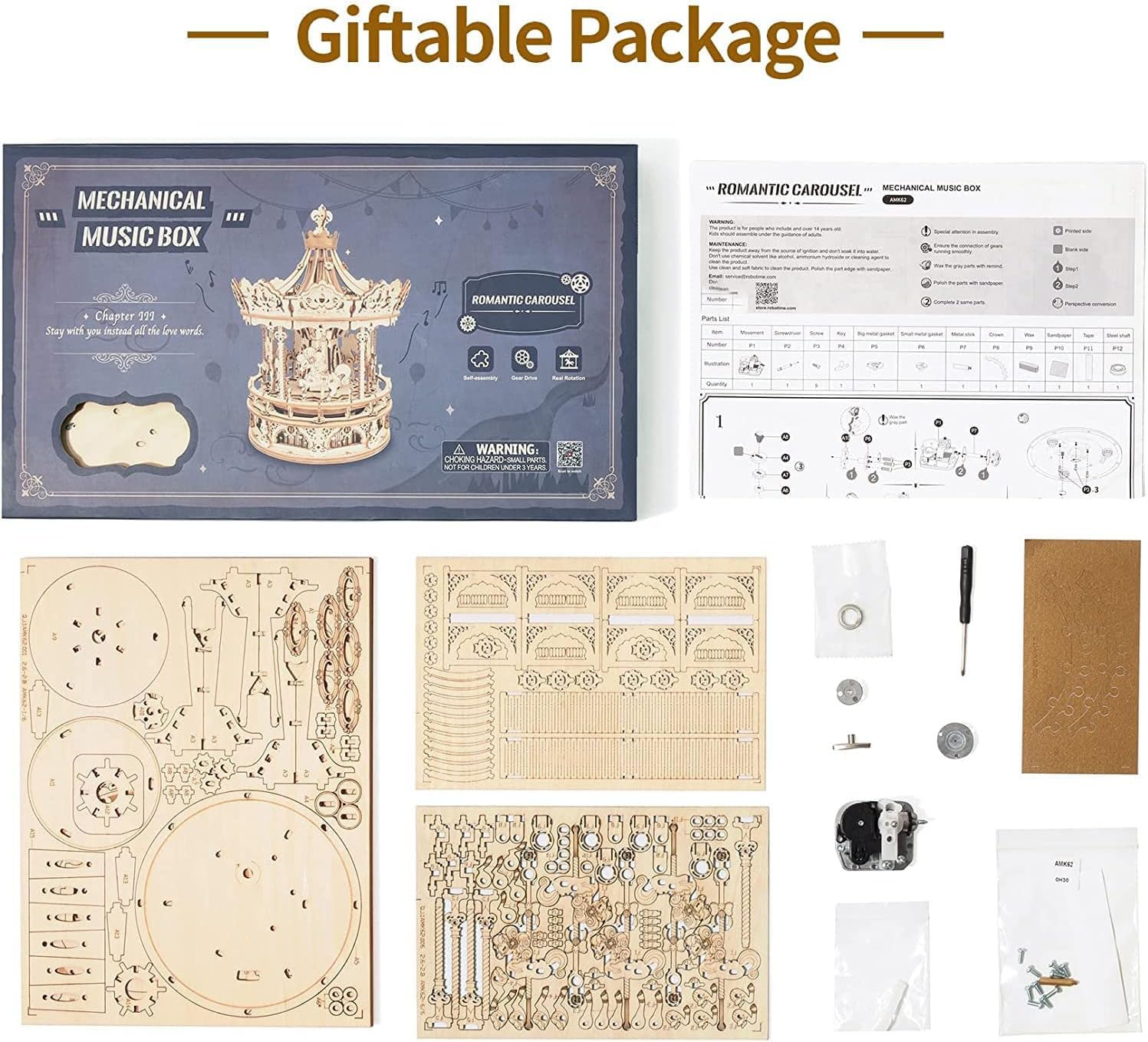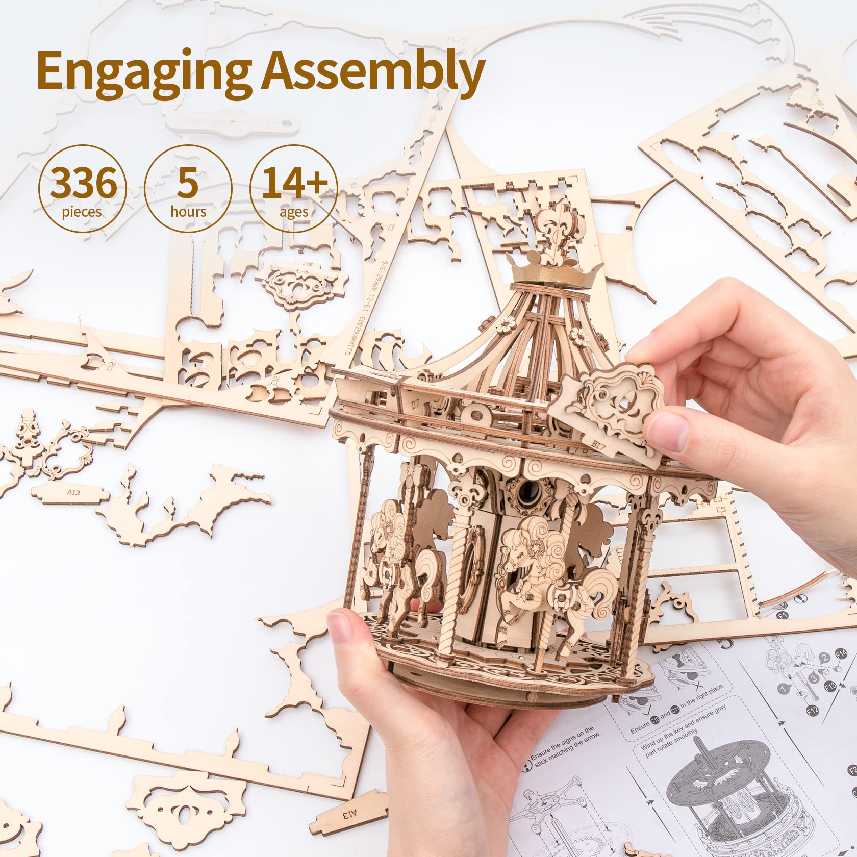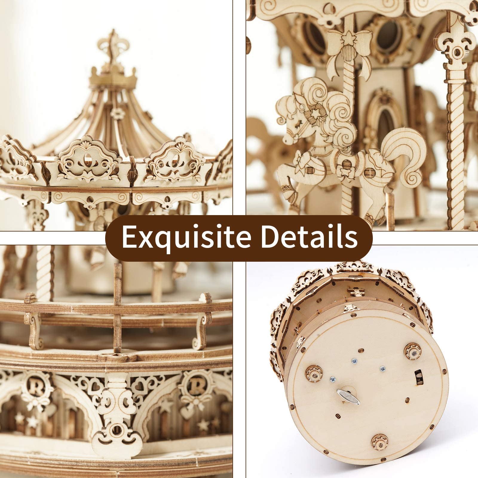 ["Mechanical Magic: The internal power movement is connected to a complex gear structure. The precise technology coordinates the different parts, bringing athletic beauty and a stable sense of harmony.","Log-color appearance and pure machines: The log-color carousel preserves childhood memories. The entire kit requires no glue or other tools during the assembly process, and each assembly depends on the interaction between the wooden parts.","Laser-Cut Technology: Benefiting from its original design with amazing details, offering you hours of wonderful DIY fun. The laser cutting technology ensures that the wooden parts are smooth, with no rough edges or sharp corners.","Detailed English Instructions: The instructions are very comprehensive and easy to understand and follow. Please read the instructions carefully before assembling these parts.","Great Gifts for Christmas and Birthdays: You can use this music box to convey your feelings. The time spent assembling the product with family members can enhance family intimacy."]