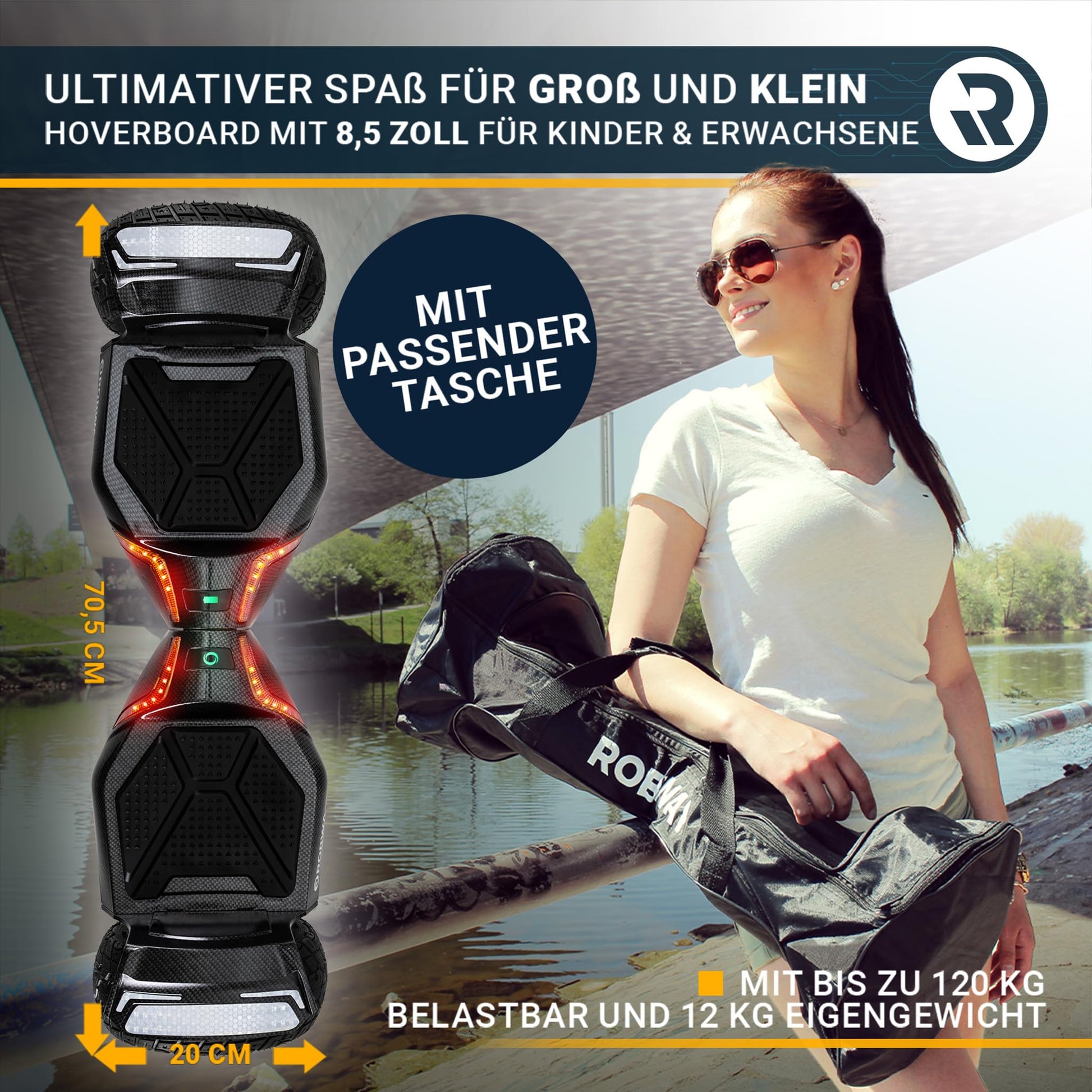 "Premium Akkus fรผr hรถchste Sicherheit โš ๏ธ๐Ÿ”‹: High-quality lithium-ion batteries with overcharge protection ensure maximum safety and reliable performance" "Smarter FahrspaรŸ mit App & Bluetooth ๐Ÿ“ฑ๐Ÿ”Š: Control via smartphone and integrated speakers with Bluetooth interface make every ride individual and entertaining" "Maximale Power & Geschwindigkeit ๐Ÿš€: Two 350 Watt motors provide 700 Watt total power & a range of 20 km at a top speed of 15 km/h" "Selbstbalancierend & Offroad Erlebnis ๐Ÿค–๐ŸŒฒ: Thanks to patented Self-Balance & Easy-Learn function, the hoverboard remains stable. With sturdy 8.5-inch tires and 15ยฐ climbing capability, you can easily conquer gravel, grass, and hills" "Deutscher Hรคndler โค๏ธ: Rely on top-notch customer service - our German support team is available by phone & email for expert advice and fast assistance"