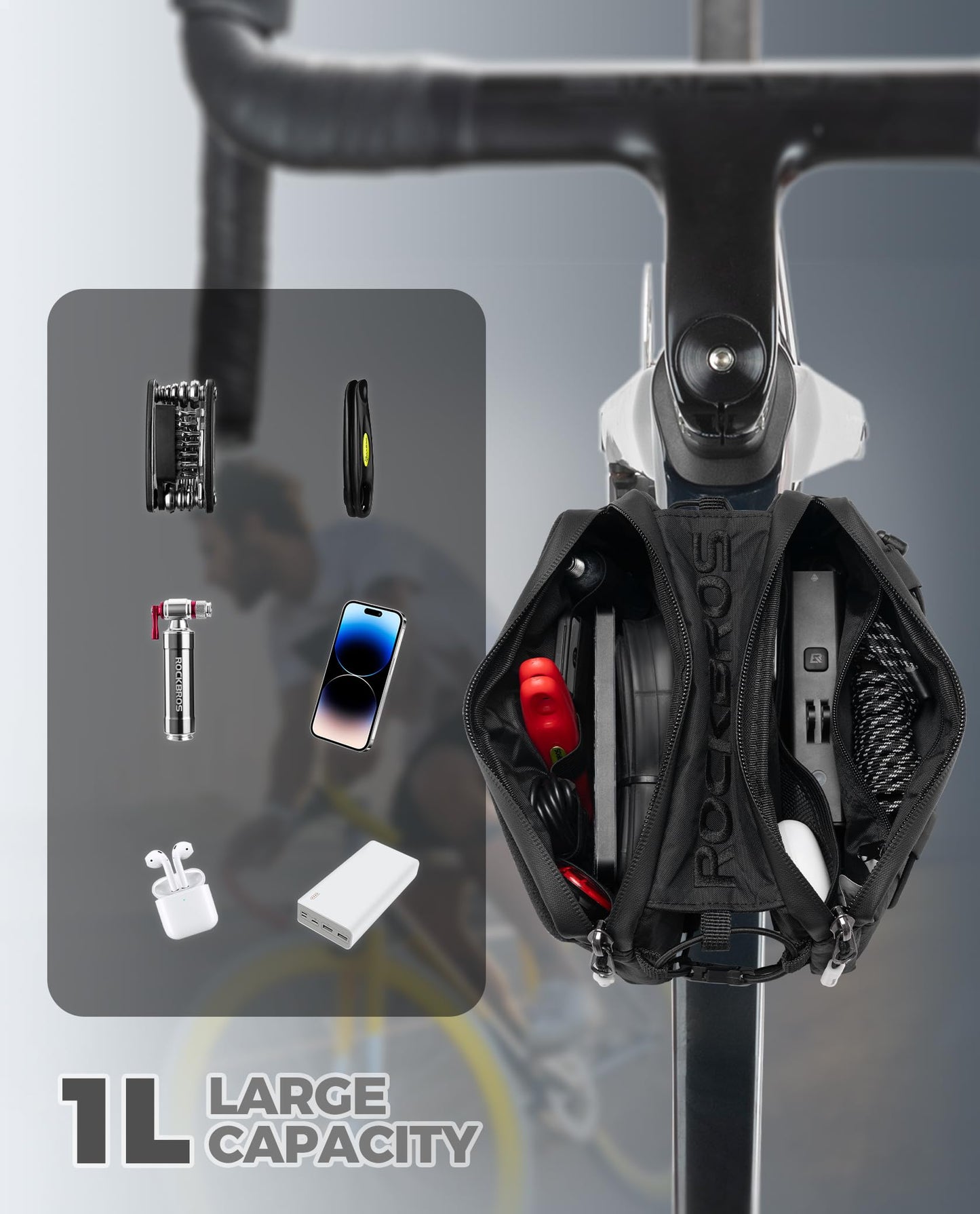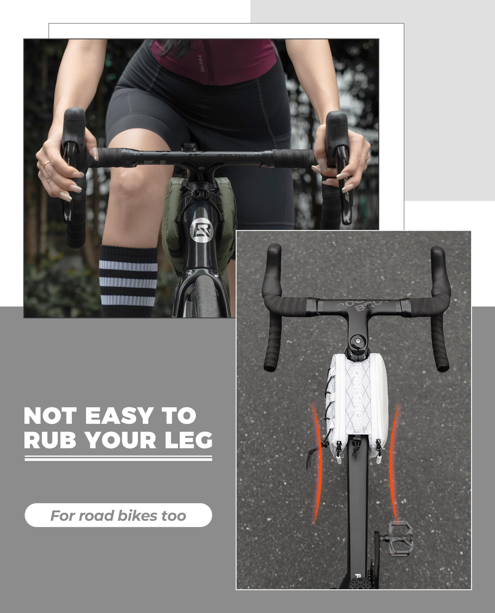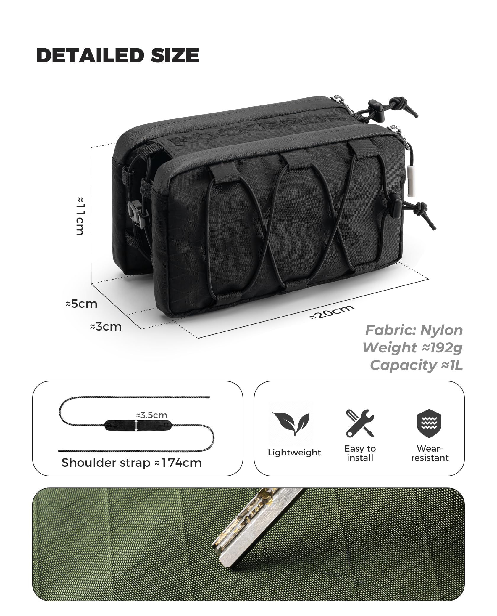 ["Slim fit: The ROCKBROS bike front bag is designed to fit snugly on the bike frame without interfering with the leg. Enjoy uninterrupted riding pleasure","Adjustable elastic cord: There is an adjustable elastic cord on the side of the bag to securely store sleeves, gloves, and other items. The bag has multiple interior compartments for neat and organized storage of your belongings. So you have everything at your fingertips","Additional storage space for pump: The bottom of the bag provides space for a pump, so you can easily inflate your tires. Perfect for your daily rides","Easy and secure attachment: The bag is securely attached to the bike with a quick release clip and elastic bands. The installation is simple and ensures a secure hold while riding","More details: a. Comes with a shoulder strap that can also be used as a shoulder bag. The bag is made of scratch-resistant and pleasant-to-touch textured material. d. five colors to choose from"]