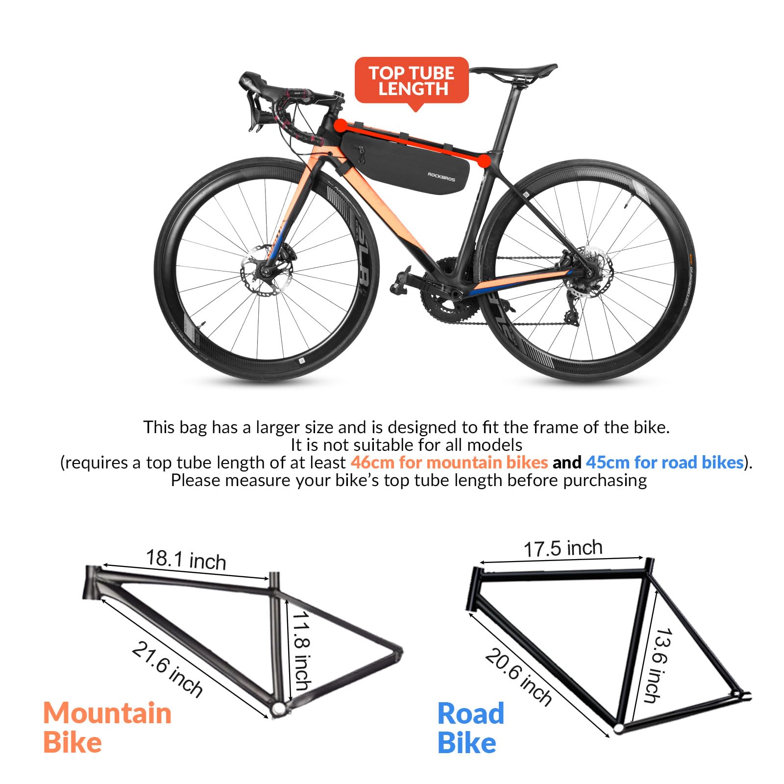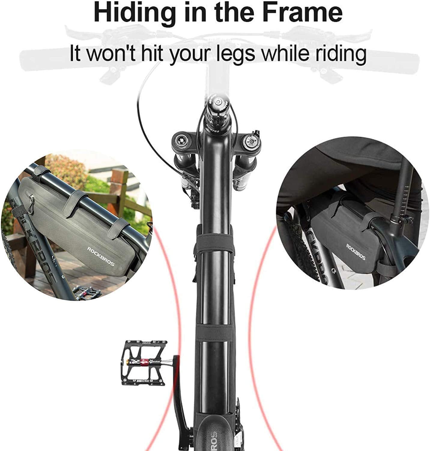 ["【LARGE CAPACITY AND EXTENDED DESIGN】15.7*2.4*4.9 inches. Approximately 3L large capacity. It can hold tools such as keys, mini pump, tire, water bottle, wallet, phone, glasses, etc.","【WATERPROOF】The high-quality outer nylon fabric and seamless TPU inner material provide comprehensive protection for your bike accessories in drizzle. Unique waterproof zippers on both sides keep your items dry.","【STABLE CONSTRUCTION AND COMFORTABLE】With adjustable Velcro straps, you can securely attach the bike bag between the top and seat tubes. The dual-sided double bag design offers more convenience for carrying items while riding.","【HUMANIZED DESIGN】Width: Only 6mm. It doesn't rub against the legs while riding. Double-sided reflective logo: Warning sign for night riding","【EASY TO INSTALL AND REMOVE】With 5 Velcro straps and 11 mounting holes, you can quickly attach and detach the bike bag on different frames."]