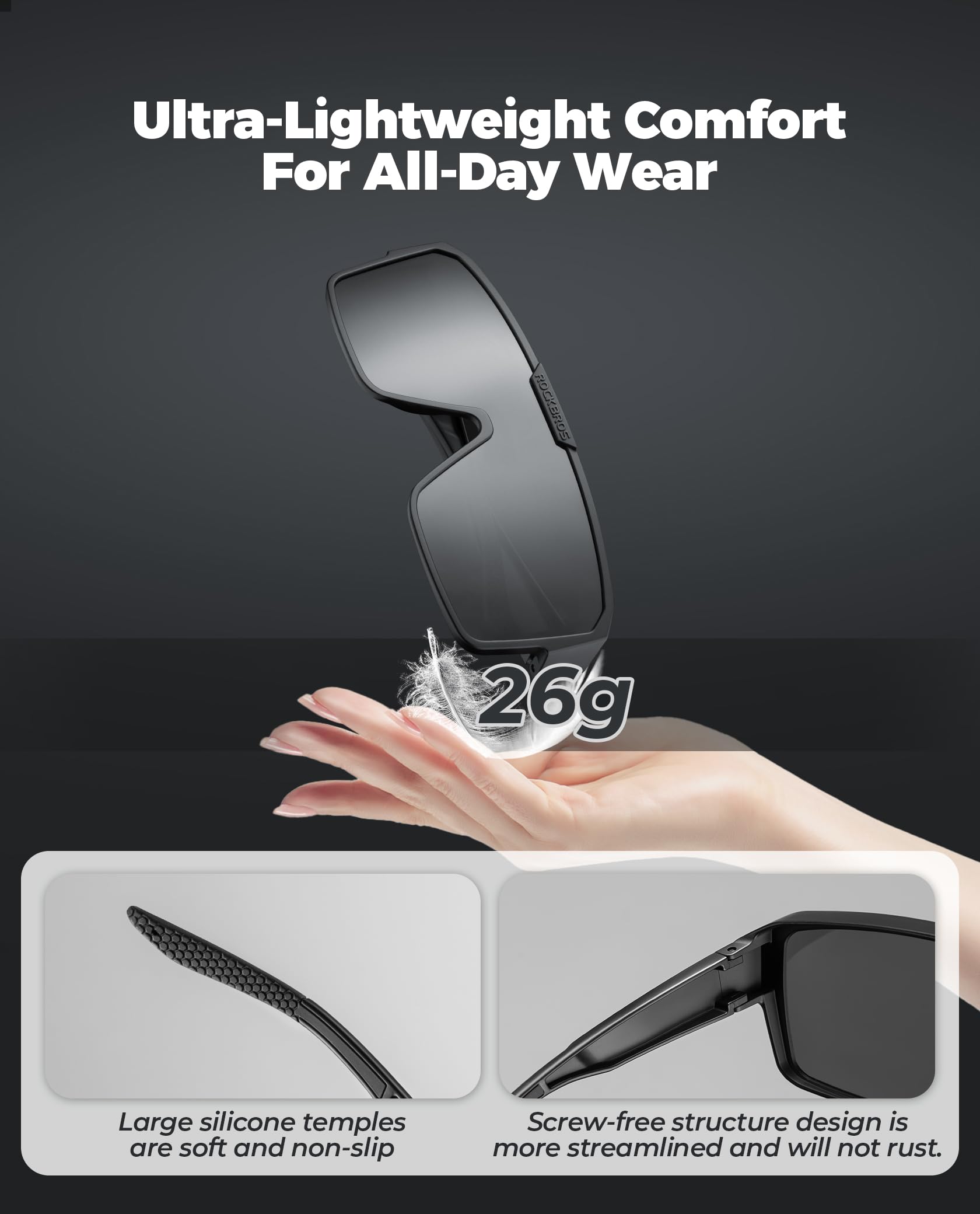 ["EASY TO USE AND COMPATIBLE: The complete lens set can be worn directly over your current glasses. For glasses wearers, these over-the-glasses sunglasses offer a practical and cost-effective solution. They are compatible with most eyeglass frames on the market, saving you the hassle of needing separate prescription sunglasses or special glasses. Whether for a bike ride or a sporty day - just put them on and go.","MAXIMUM PROTECTION: Designed with functionality and style in mind, these wraparound sunglasses feature a classic frame shape that provides a secure and comfortable fit. Whether cycling, fishing, running, or any outdoor adventure - these sunglasses offer optimal sun protection for sensitive eyes, including those recovering from surgery.","TAC POLARIZED LENSES FOR ENHANCED CLARITY: Equipped with polarized TAC lenses, these sunglasses significantly reduce glare, improve contrast, and provide clearer and sharper vision in all lighting conditions. Whether it's a bright sunny day or cloudy - the polarized glasses minimize eye strain and enhance visual clarity, making outdoor activities more enjoyable and comfortable.","UV400 PROTECTION: Thanks to the UV400 lenses, your eyes are fully protected from harmful UVA, UVB, and UVC rays. These lenses offer complete protection against harmful sun rays, ensuring you are always safe and secure while cycling, driving, fishing, or golfing.","ULTRA LIGHTWEIGHT ALL-DAY COMFORT: Weighing only 26 grams, these sunglasses can be comfortably worn for long periods without discomfort. The wide-cut silicone temples feel soft, while the 3D hollow-engraved texture design promotes breathability, further enhancing comfort."]