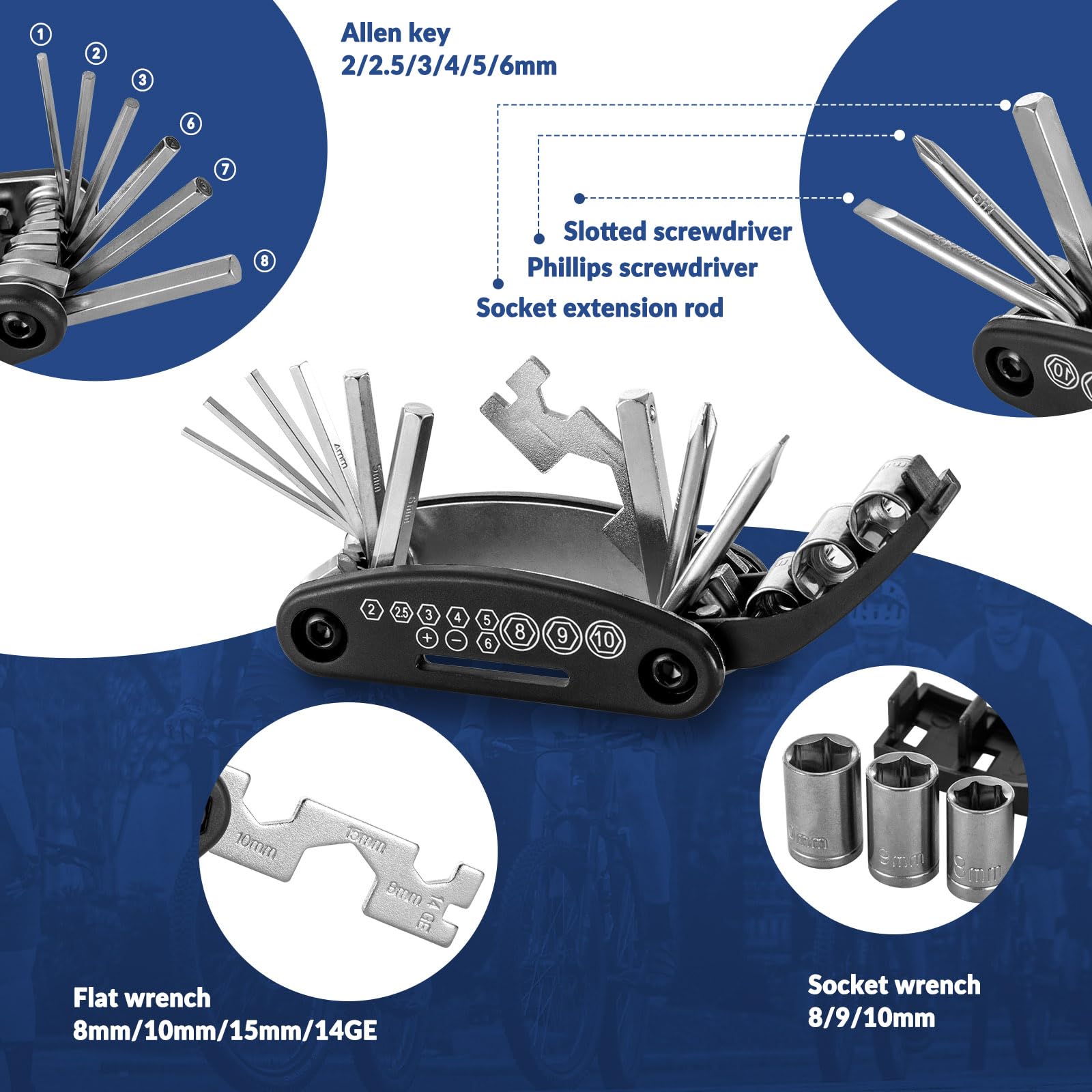 ► MULTIFUNCTIONAL TOOL: A 16-in-1 tool made of galvanized steel is included. ①Allen keys: 2 / 2.5 / 3 / 4 / 5 / 6 mm ②Socket wrench: 8 / 9 / 10mm ③Slotted screwdriver ④Phillips screwdriver ⑤Solid wrench: 8/10/15mm ⑥Socket Extension Rod.