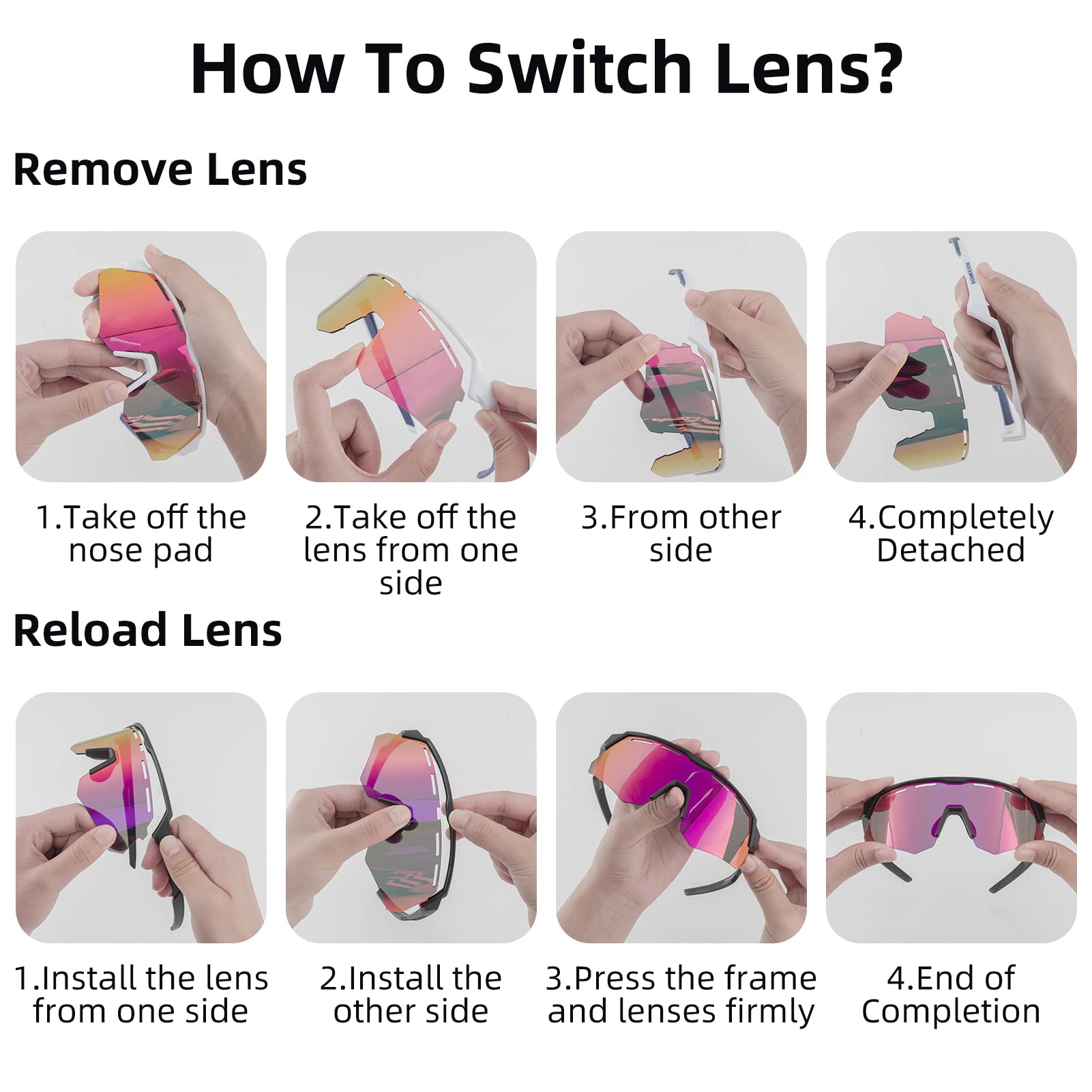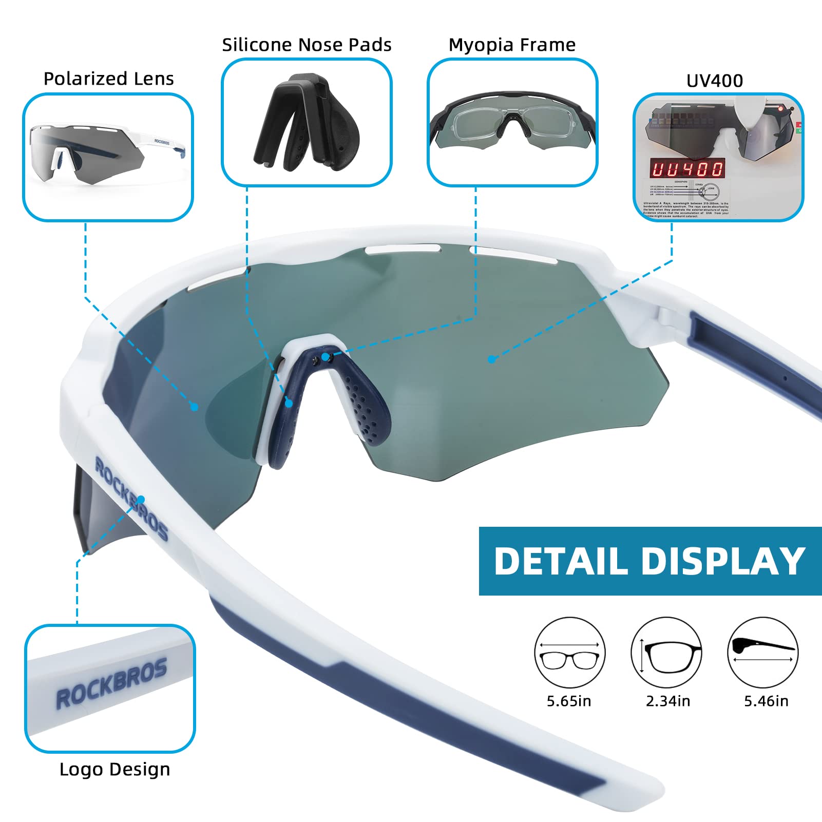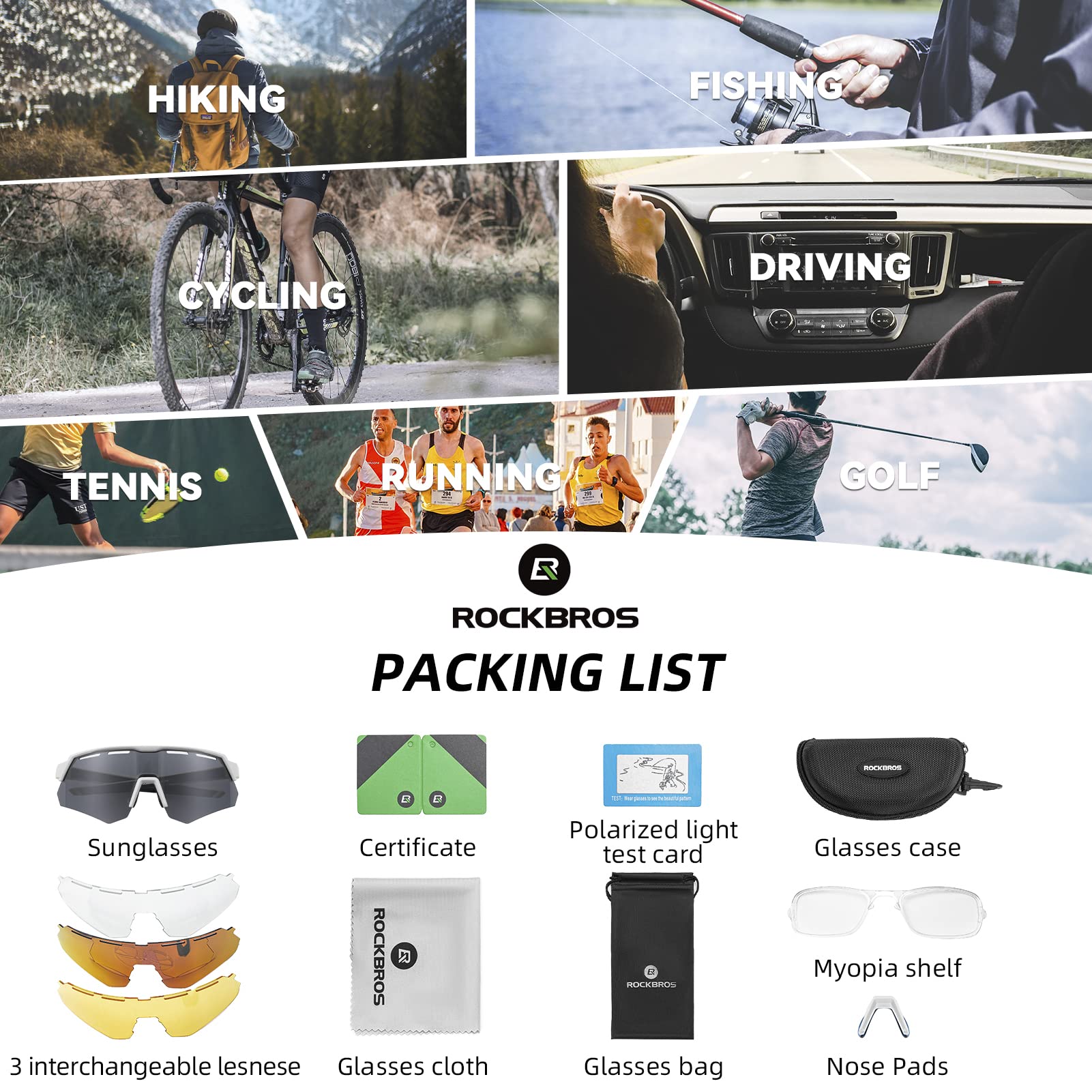 ["【4 interchangeable lenses】: The ROCKBROS Polarized Sunglasses come with 4 interchangeable lenses that can be applied to different scenes. It includes 1 gray polarized TAC lenses, 1 colorful PC lenses, 1 yellow PC night vision lenses, and 1 transparent PC lenses.","【Lightweight & Comfortable】: These sports glasses use TR frames that are lighter. Adjustable nose pads can make wearing more comfortable.","【100% UV Protection】: These sports glasses protect your eyes from UVA, UVB, and UVC radiation. It also provides wind and glare protection during outdoor sports such as cycling, fishing, motorcycling, running, skiing, baseball, volleyball, driving, triathlon, mountaineering, trekking, golf, hiking, boating, hunting, etc.","【Package includes】: Polarized Sunglasses*1, Interchangeable lens*4, Interchangeable nose pads*1, EVA Box*1, Glasses case*1, Glasses cloth*1, Test card*1, Myopia frame*1.","【Notes】: If for any reason you are not satisfied with our products, please contact us. You can return and get a refund."]
