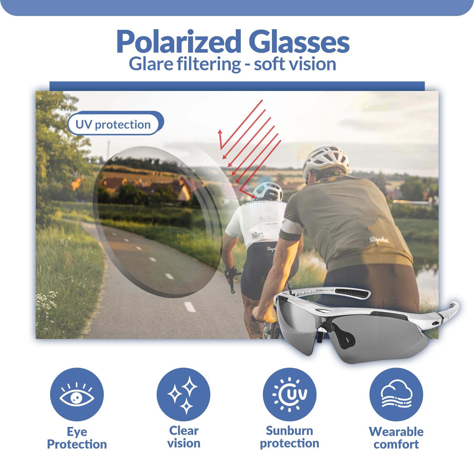 ["Self-tinting glasses: The glasses are equipped with self-tinting lenses that change their color according to UV intensity. They provide a comfortable viewing experience in different lighting conditions.","Improved UV protection: ROCKBROS sports glasses are made of high-quality, highly durable PC lenses that offer a long lifespan. The lenses are equipped with UV400 protection, effectively blocking harmful UVA and UVB rays, thus fully protecting the wearer's eyes.","Detachable temples: Thoughtfully designed, detachable glasses temples. The temples of the cycling glasses can be removed and replaced with a sports headband. This makes the glasses more stable and less likely to fall off while riding or running.","Friendly for nearsighted individuals: Sunglasses with integrated nearsightedness frames for the needs of eyeglass wearers. The lightweight design and comfortable nose bridge reduce the pressure of the glasses on the face. They are also very comfortable for extended wear.","Versatile use: These sports glasses are suitable for a variety of activities such as cycling, mountain biking, motorcycle riding, driving, baseball, climbing, fishing, golf, hiking, etc. The self-tinting lenses can be worn in sunny, rainy, daytime, evening, and other conditions. Three colors are available, stylish and practical."]