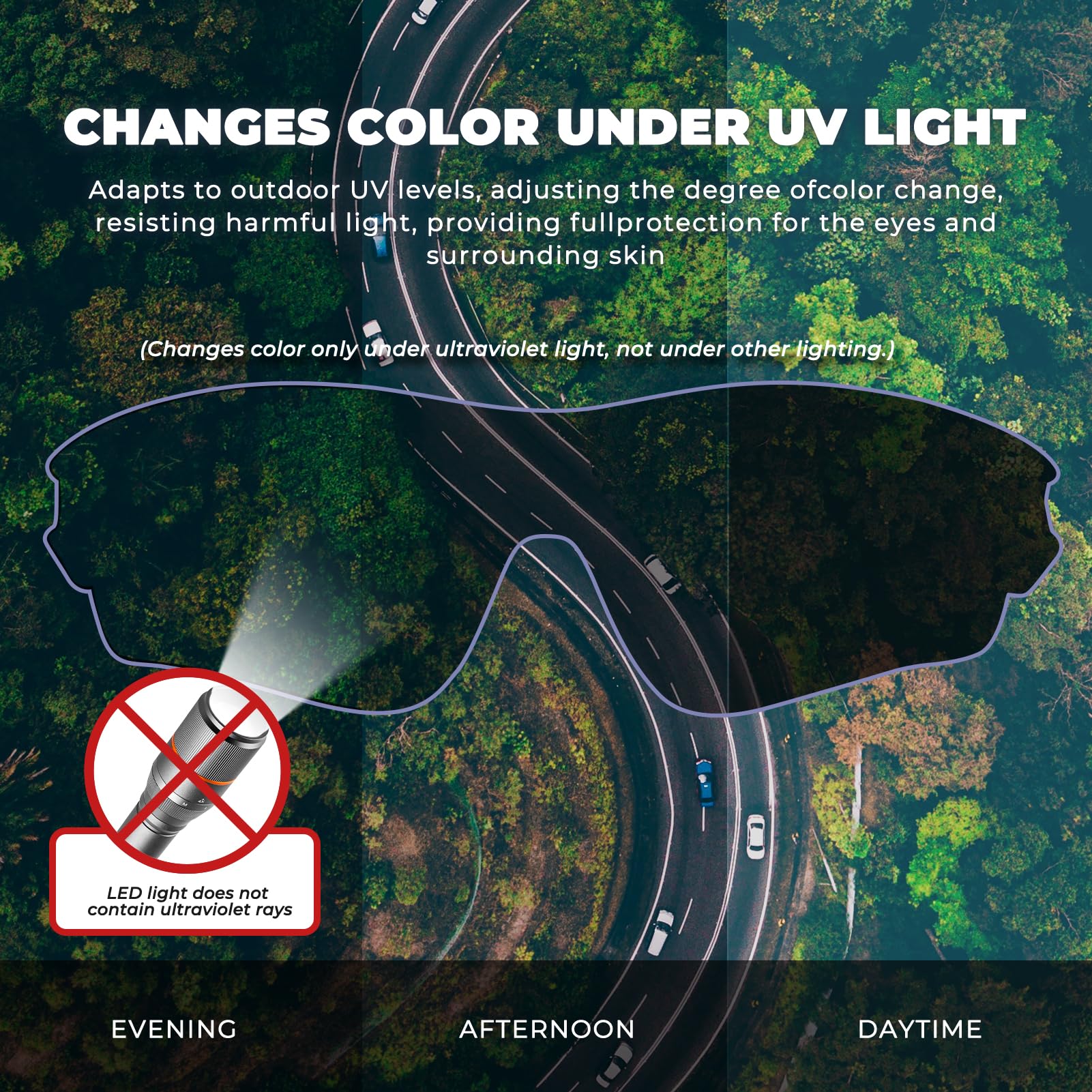 ROCKBROS self-tinting sunglasses for men and women. Photochromatic lenses for UV400 protection. TR90 frame for sports like cycling and fishing.