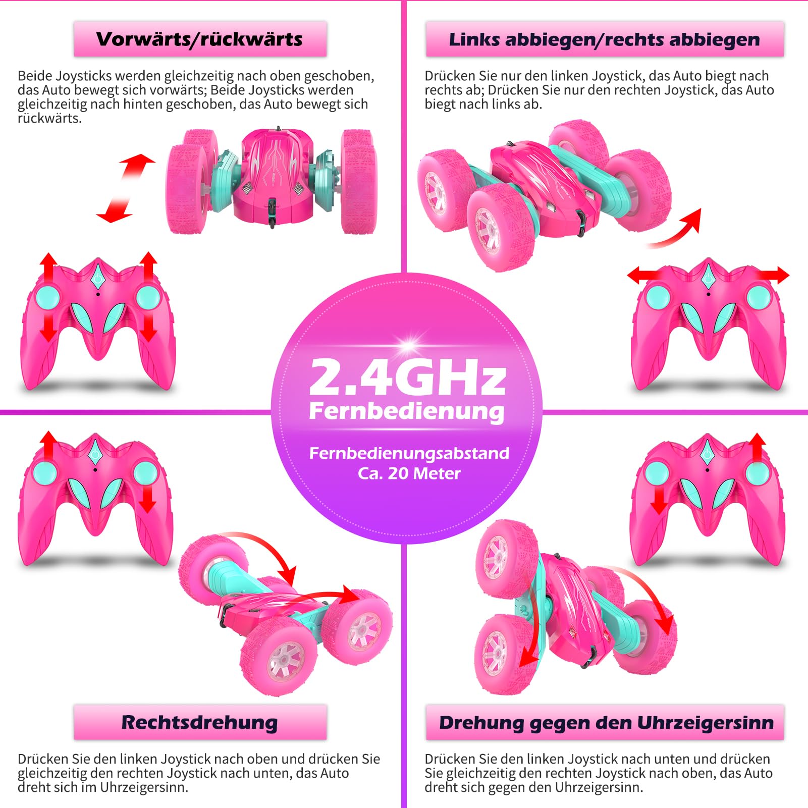 Rodzon Remote Control Car Crawler for Girls Ages 3 4 5 6 7 8 9+ LED Blinking Toy Girls Gifts Kids Toy 2.4Ghz 4WD 360° Flip RC Car with 2 Rechargeable Batteries (Pink)