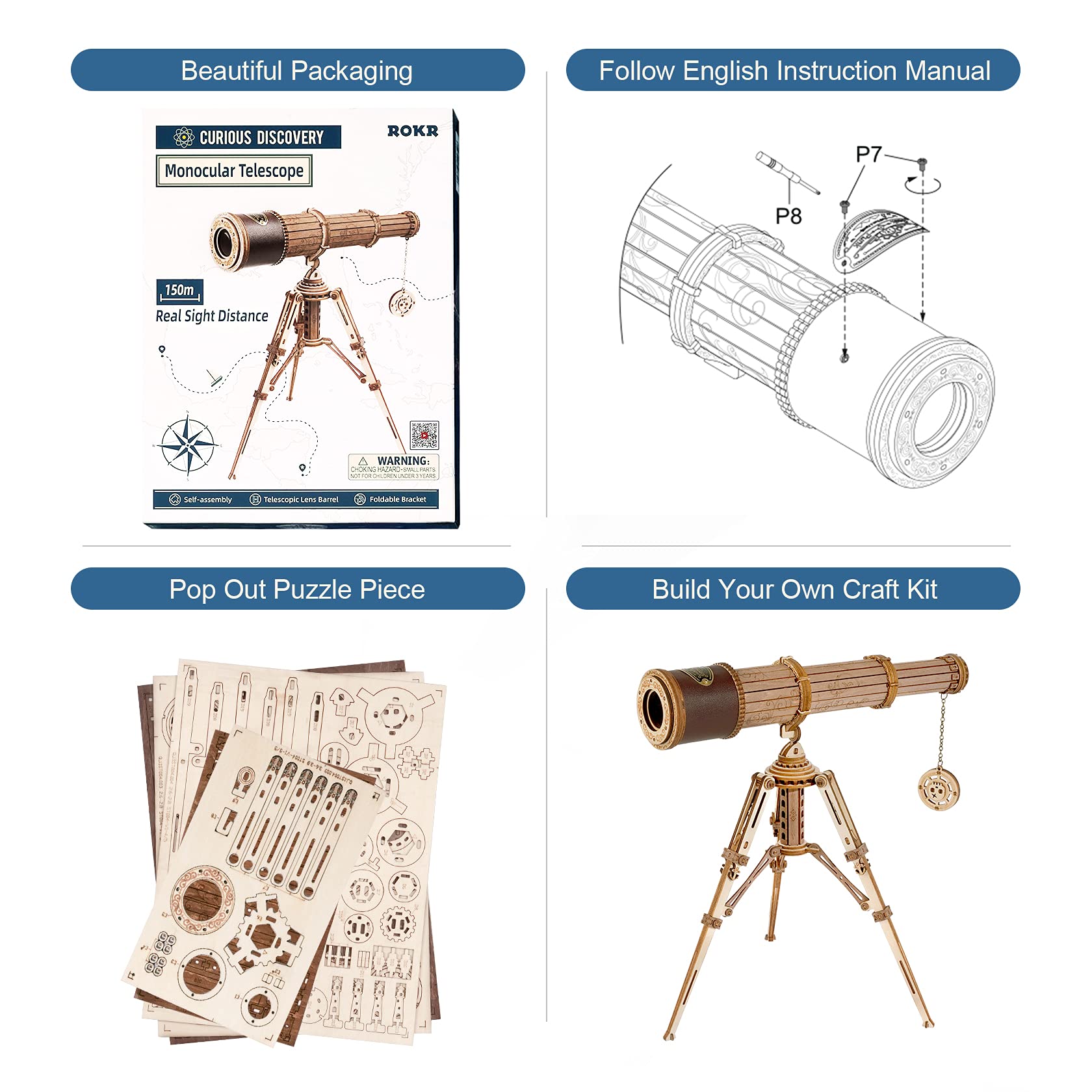 ROKR 3D Wooden Puzzle Monocular Telescope Wood Model Building Science Gifts for Adults Kids over 14 years 314 Pieces, Monocular Telescope
