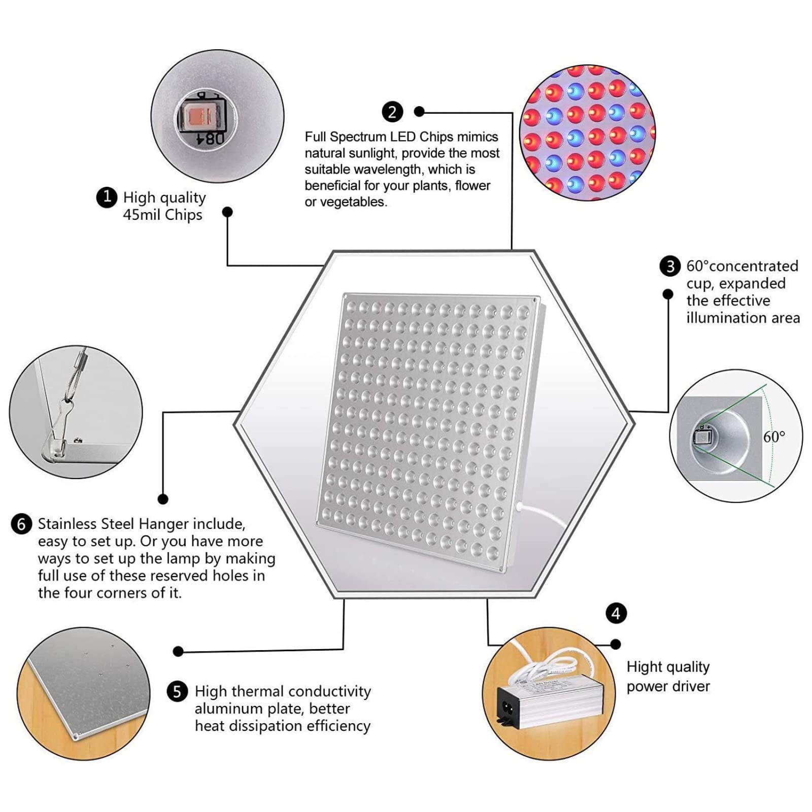 ["LED Plant Lamp Size: 276 * 276 * 14 mm; Weight: 2.09 lbs, very thin and light! Recommended height: 0.3m-1m. It is a very good device for the germination stage and flower stage.","169 LED chips; 117 red LED chips (630 nm wavelength) + 52 blue LED chips (470 nm wavelength). Red: Blue = 2.25: 1, very useful for all plant growth. The red and blue light centralizes on most plants and flowers!","In comparison with other plant lamps, the difference of our LED plant light is the dissipation plate on the back of the LED lamp. We use a special thick aluminum alloy plate as a dissipation plate, The heat transfer performance is better than normal panel grow lamps on the market! This design helps to radiate the heat to the air faster than the panel with cardboard plate and extend the lifespan.","NO fans, no noise, very quiet, you can even use it in your living room","Widely used in greenhouses, growing fields, indoor gardens, hydroponic cultivation, potted plants."]