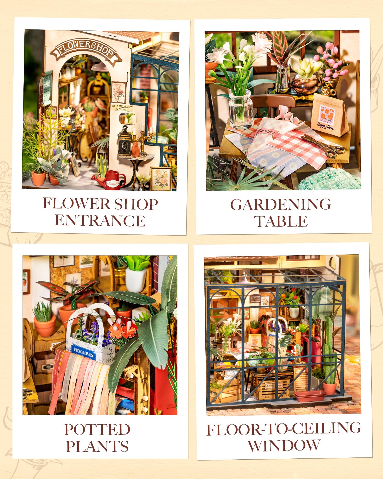 ["Rolife Dollhouse Emily's Flower Shop"] Step into Emily's Flower Shop, where every corner blooms with charm. The shop is filled with colorful bouquets, lush greenery, and delicate decorations that bring a fresh, romantic atmosphere to your miniature world.