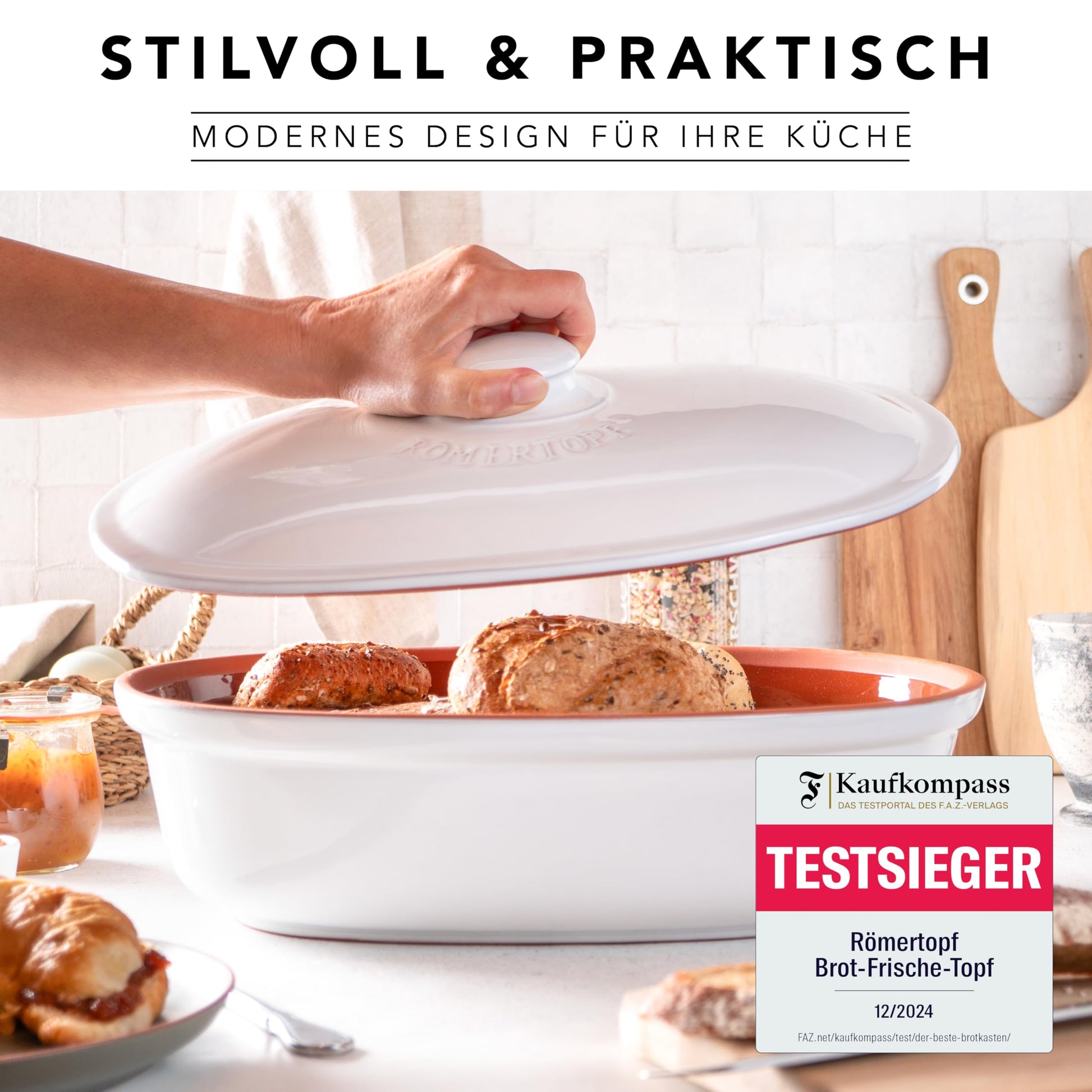 Scope of delivery: Römertopf Fresh Pot oval in white with lid. Ideal for plastic-free storage of bread, rolls, or pastries. Made of natural ceramic."