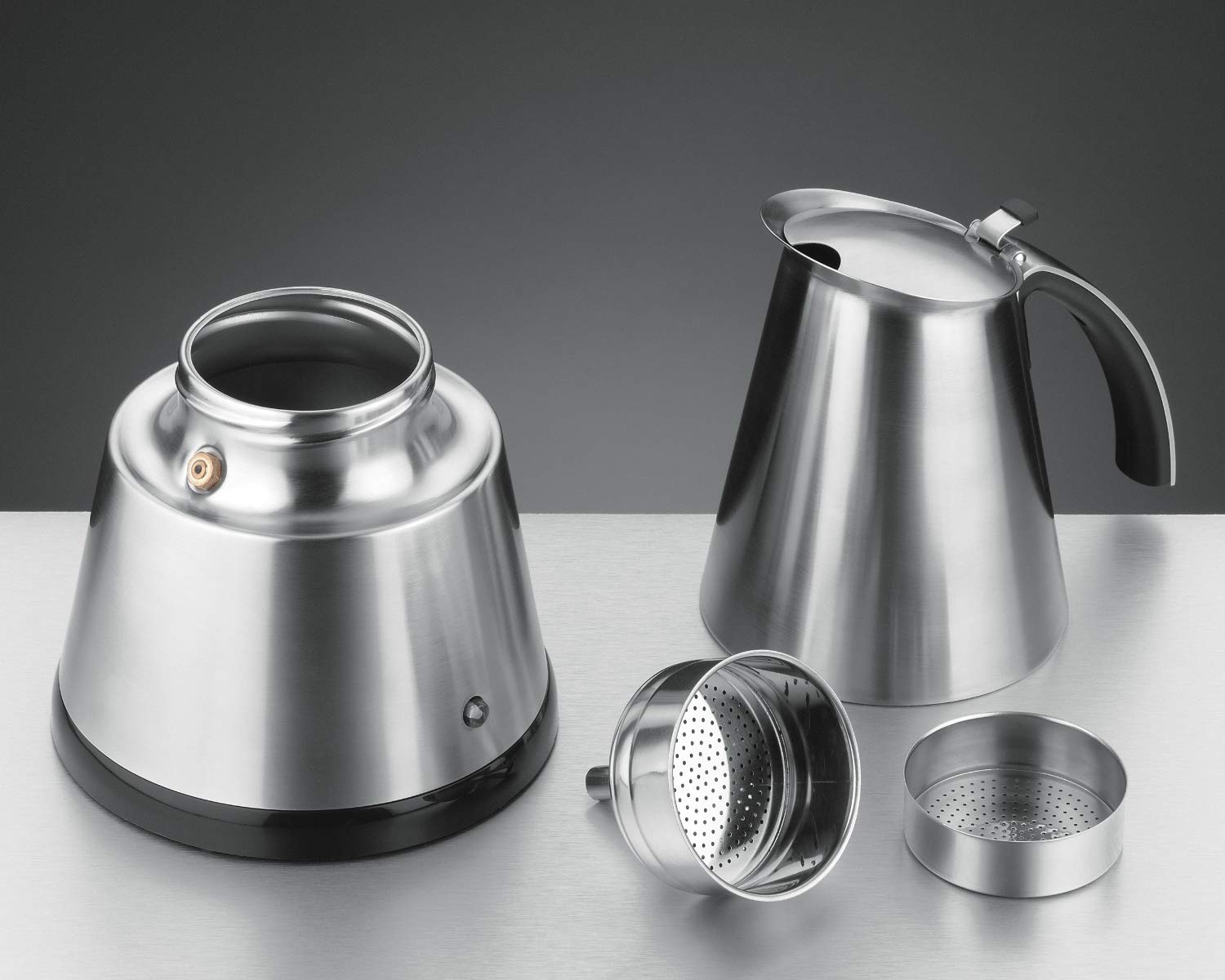 ["Attractive stainless steel espresso maker, electrically heated, hidden heating element","with stainless steel filter insert for either 3 or 6 cups of espresso","Electric connection in cordless technology, compact 360° central base, pot can be placed all around","illuminated on/off switch, automatic shut-off, ergonomic, heat-insulated handle","Overheating and dry-run protection, safety valve, integrated cable winding"]