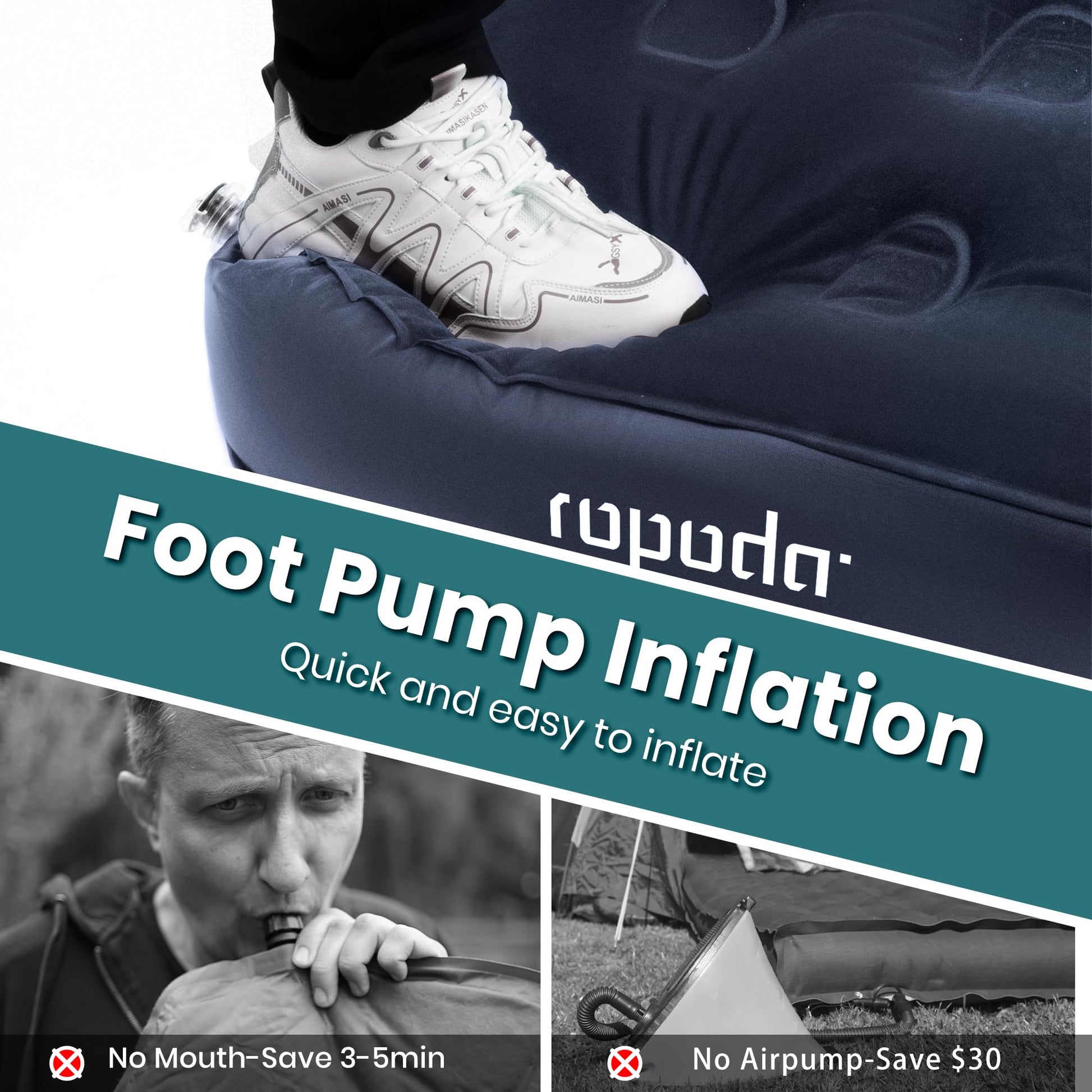"Extra wide & thick sleeping support: Ropoda Self-Inflating Sleeping Pad with Pillow is up to 74.01*30.31*11.02 inches, after inflation it keeps you away from the ground and provides comfortable support after inflation","Flocked surface: The inflatable sleeping pad is made of soft flocked material on the surface, which can increase warmth and wear resistance. The comfortable texture with special stripes brings you a good night's sleep","Durable PVC material: The back of the air mattress is made of durable PVC material, which can be used for outdoor camping to avoid friction damage on the ground","Quick inflation: The inflatable sleeping pad is equipped with an improved built-in foot pump and a leak-proof membrane exhaust valve. Inflate with foot","Compact & portable: The sleeping pad weighs 3.53 lbs and can be folded into a 11.81 x 11.02 x 3.94 inch bag with storage bag and repair cloth. It is suitable as a guest bed replacement, and as camping gear"