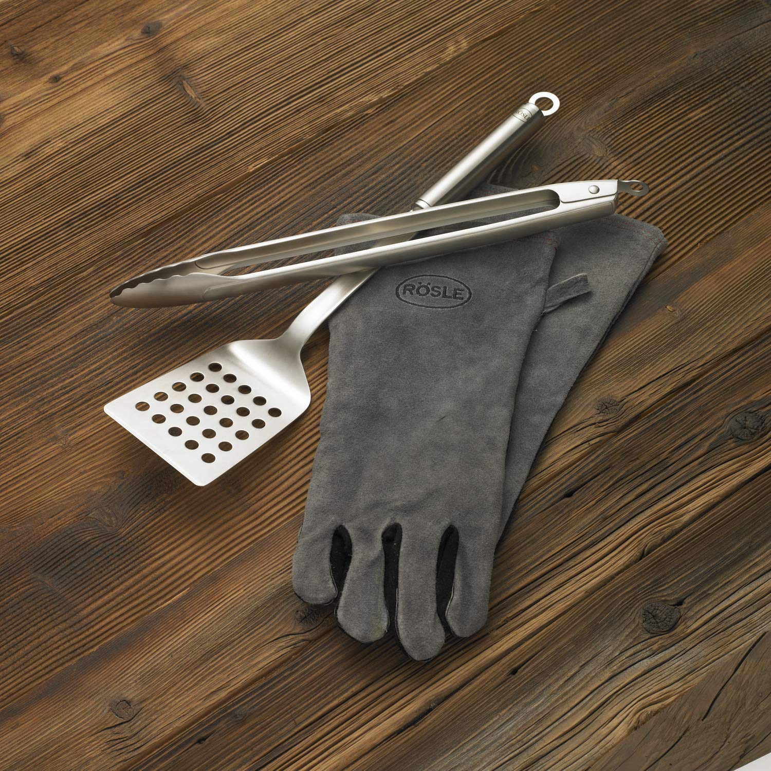 RÖSLE Barbecue Set 3-piece, high-quality grill set with leather BBQ gloves, BBQ turner, 40 cm grill tongs, stainless steel 18/10, dishwasher safe.