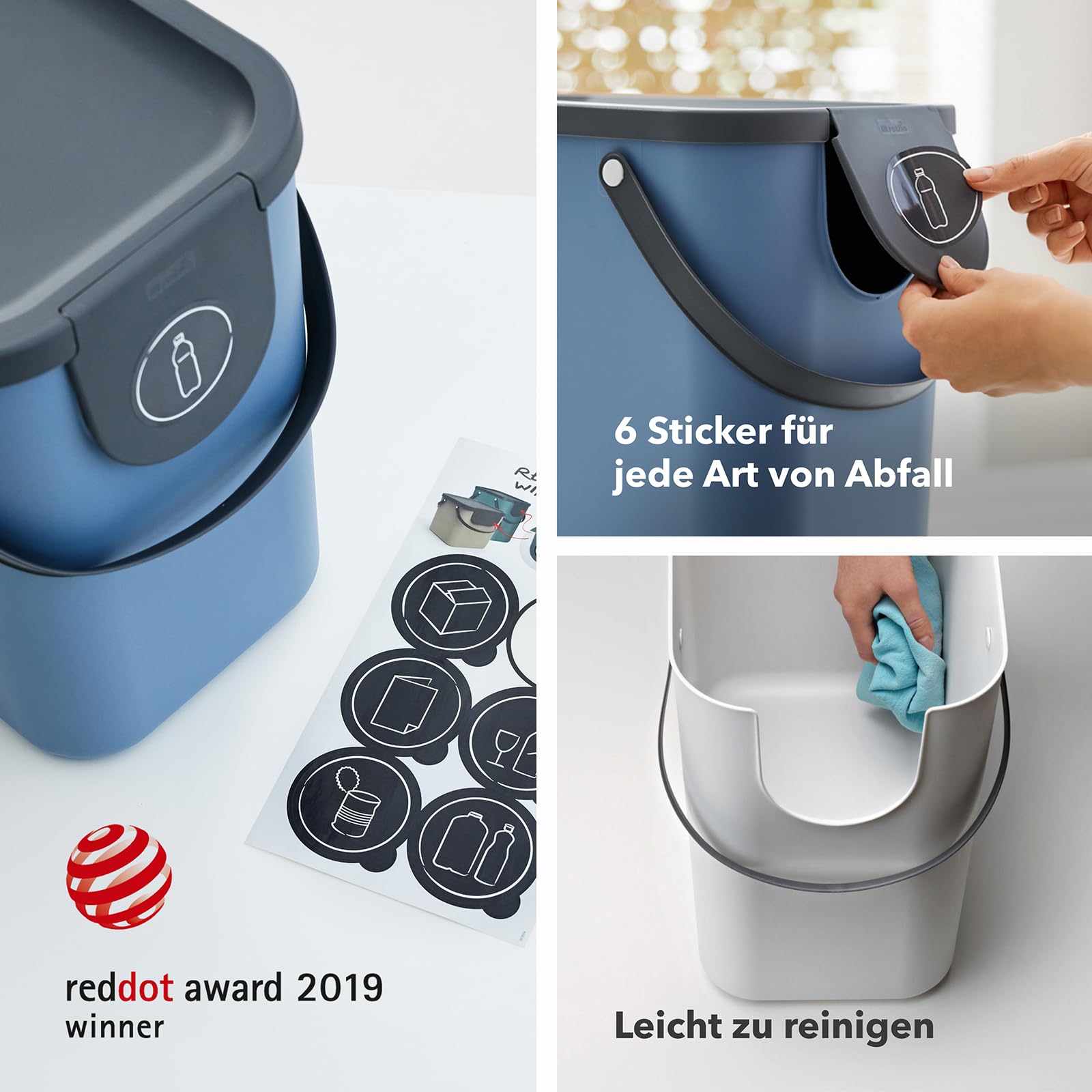"Sustainable waste separation: Waste separation system with lid and two convenient carrying handles - Perfect for separating paper, cardboard, glass, plastic etc. - made from recycled plastic","Universal & modular: Can be used individually or as a set - Securely stackable - attractive design that can also be used in living areas. Expandable as 2-fold / 3-fold or multiple separation system.","Space-saving slim & practical: Lid can be opened even when waste separation systems are stacked - Easy to carry - With various stickers for labeling - easy to clean","Load capacity up to 40 kg - Waste container capacity: 25 liters - Practical system for separating waste - Dimensions: 40 x 23.5 x 34 cm (LxWxH)","Scope of delivery: 1x Recycling waste sorting system, container made of plastic with two handles - 6 stickers with motifs (cardboard, PET, glass, paper, residual waste) - container cappuccino, lid and handle anthracite - manufactured by Rotho"