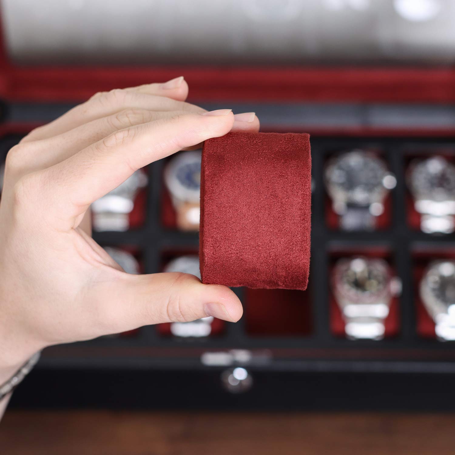"12 LARGE WATCH COMPARTMENTS: Each cushion accommodates a small or large watch up to 60mm. There is ample space between the lid and cushion for watches of any size. Note: We do not recommend using our red interior lining with white or light-colored straps, as the red color may rub off during extended storage.