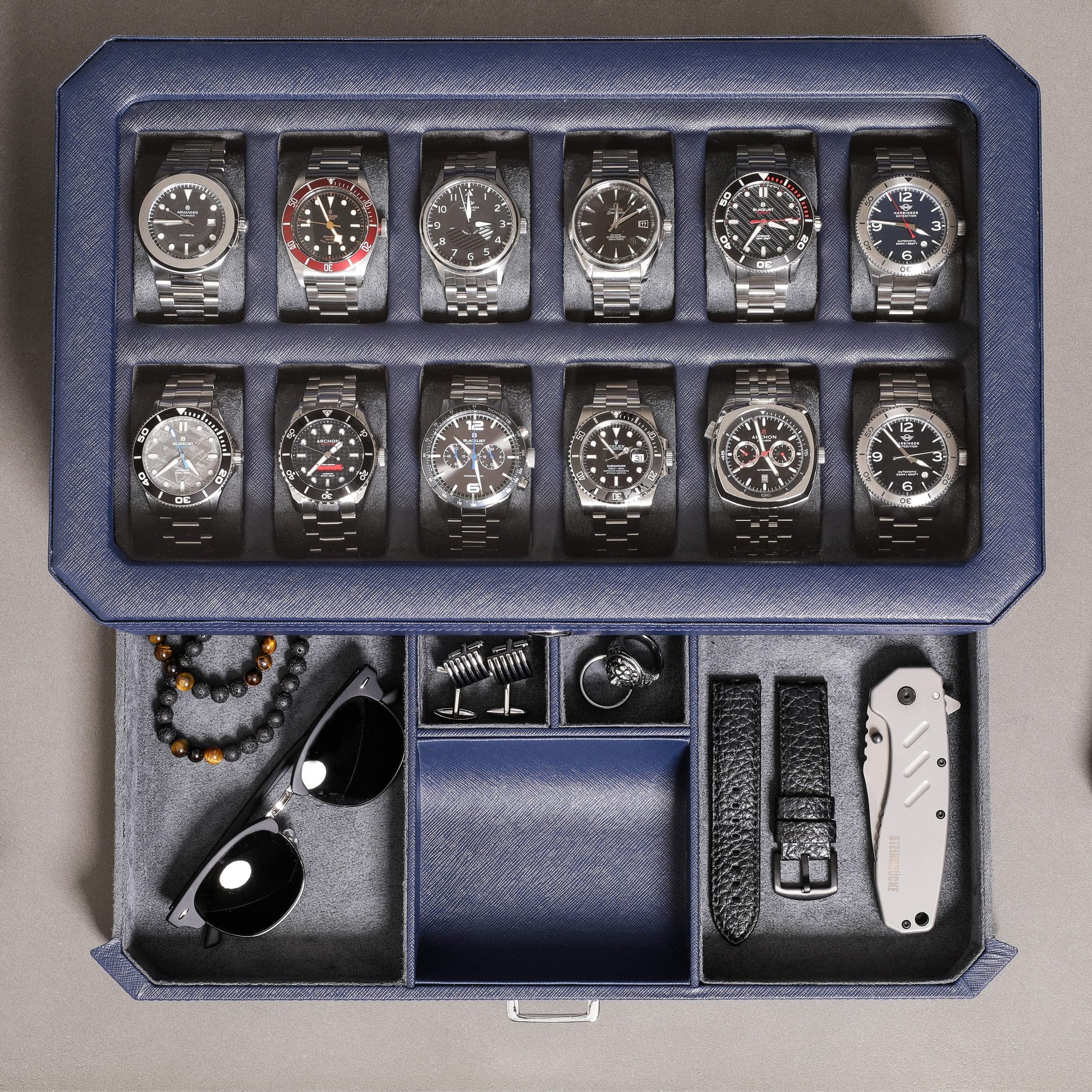 ["Watch display care for men and women: Each cushion in our watch organizer holds a small or large watch (up to 55 mm) neatly side by side and fits watches with a size of 16.5 cm and above. Plus, there is plenty of space between the lid and cushions of our watch holder to accommodate watches of all sizes.","Measurements: The exterior of our jewelry holder is 40.5 cm long, 24 cm wide, and 13.5 cm high, and the bottom drawer has a 3.2 cm clearance. The entire box weighs 3.4 kg. The cushion circumference is 18.4 cm and compressible to 16.2 cm. If your watch is smaller than 16.2 cm, you can leave the closure open to fit. Our men's accessory case is the perfect storage and presentation solution for any watch collector.","Twelve compartments: With twelve (12) slots, our jewelry boxes and organizers provide plenty of space to store your entire watch collection. Our storage box with lid looks great and doubles as a beautiful and stunning watch case.","VALET DRAWER: The pull-out drawer in our watch display case can hold additional watches and watch straps or provide extra space to store your cufflinks, rings, tie clips, sunglasses, pens, money, cards, or watch tools.","Unmatched quality and sophisticated design: Our men's watch holder features a unique, modern design that is the perfect combination of class and functionality. Each men's jewelry box organizer uses a wooden frame wrapped in high-quality PU leather. The interior of each of our men's watch cases is lined with elegant micro-suede."]