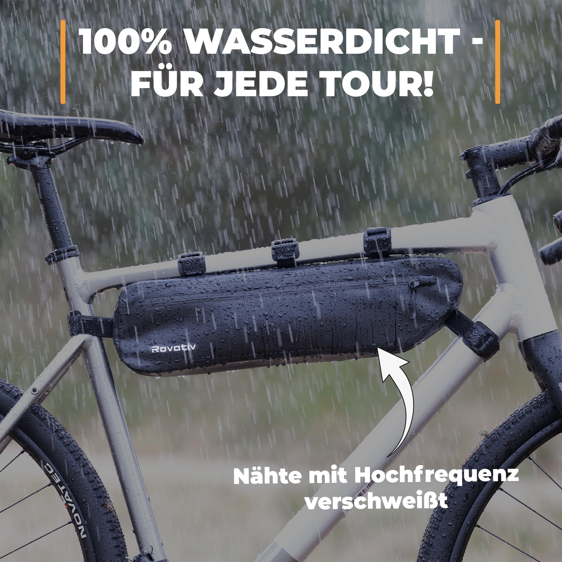 ["✅ 100% Waterproof: Thanks to welded seams, our frame bag reliably keeps the contents dry. With two separate compartments for more organization.","✅ Sturdy Attachment: Trust our extra strong velcro straps for a quick and secure attachment of your bike frame bag - designed for the challenges of gravel biking.","✅ Robust & Durable: Made of particularly durable TPU fabric, your new frame bag is extra robust and durable.","✅ Timeless Design: We value high-quality craftsmanship and functionality. Whether for bikepacking or ultracycling.","✅ Rovativ, a startup from Dresden: We specialize 100% in waterproof bikepacking bags and continuously expand our range."]
