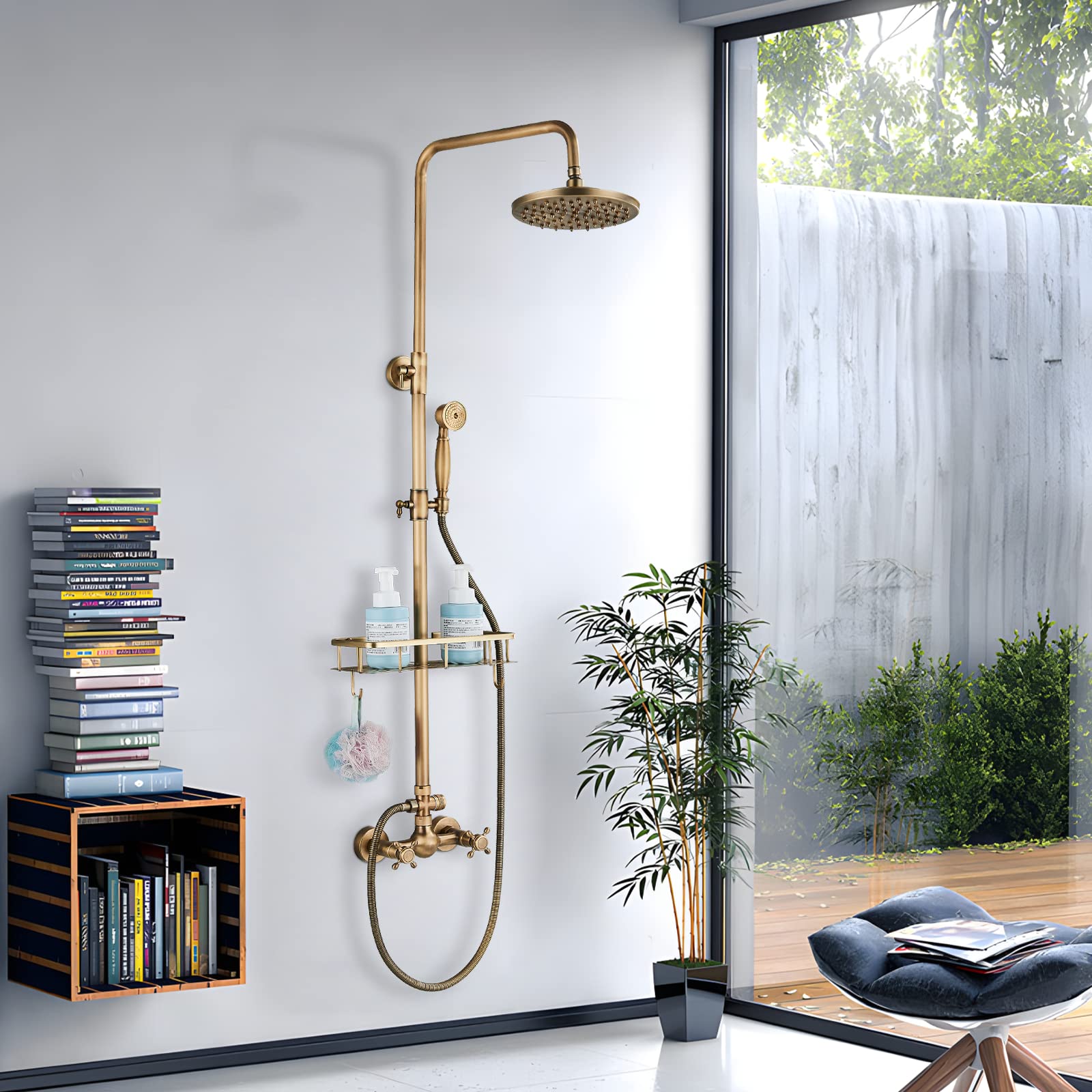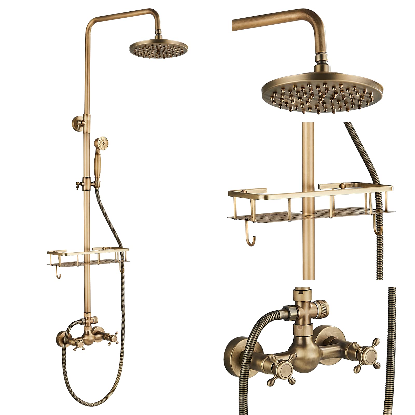 Rozin Brass Antique Shower Faucet with Hand Shower Faucet 8 Inch Shower Head Rain Shower Head Rain Shower with Storage Shelf