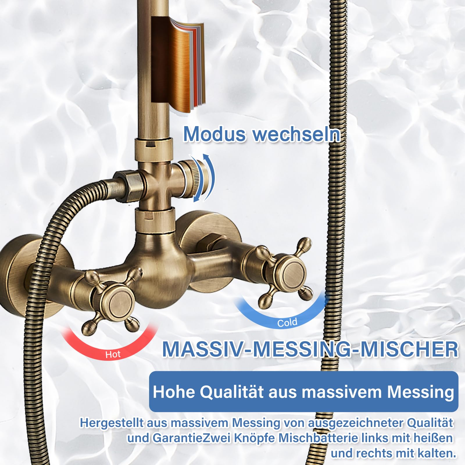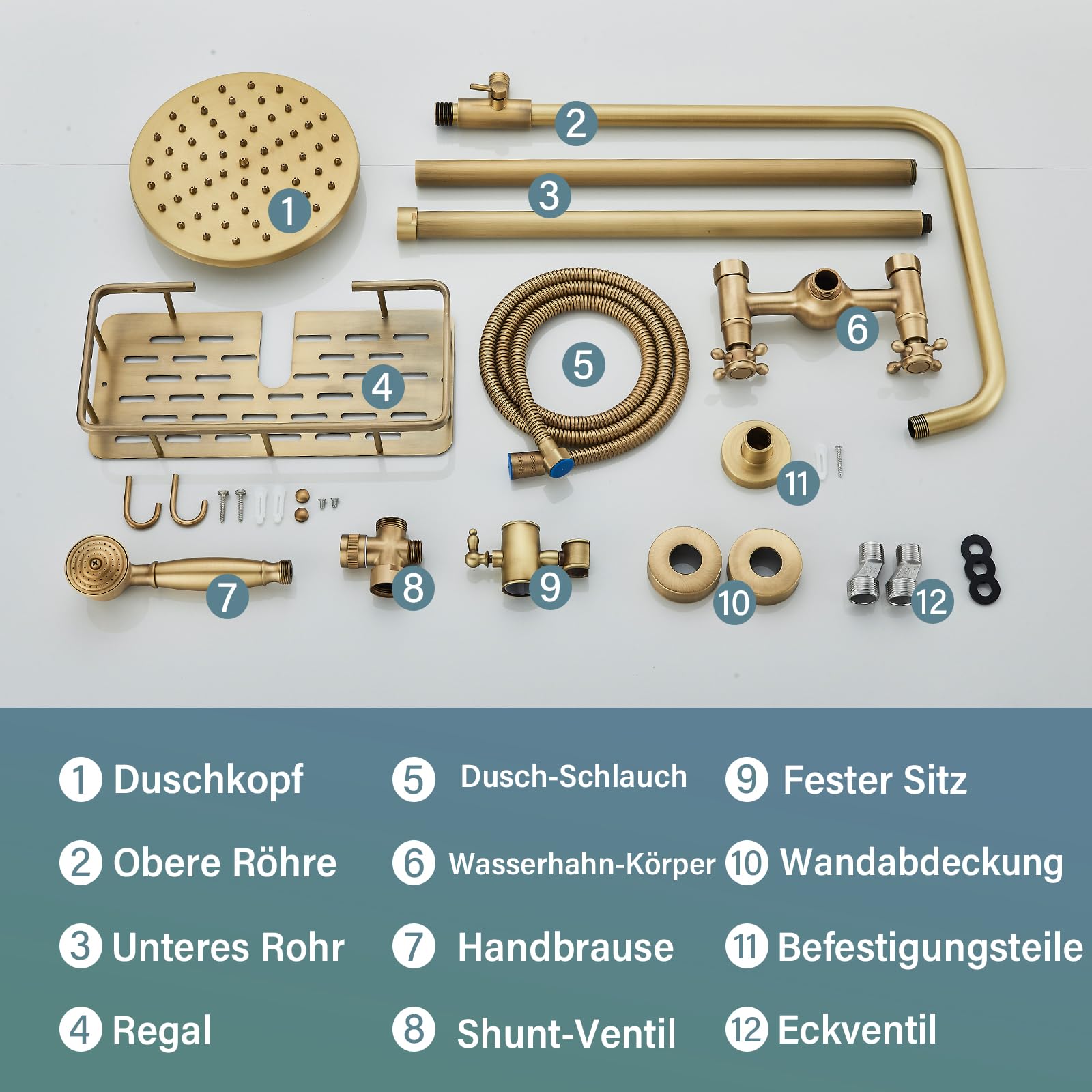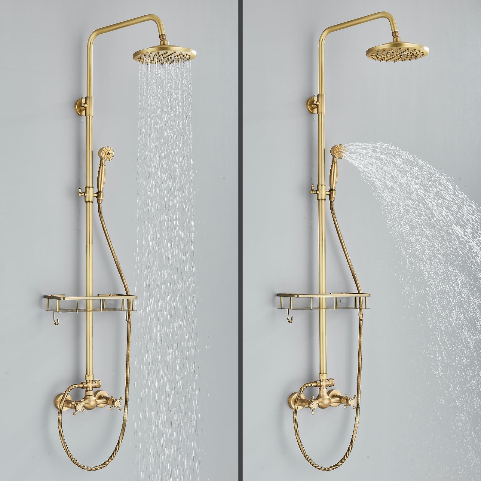 ["❤Retro-Style: The vintage style, antique brass finish, and classic design perfectly match any scene. Special coating permanently protects against lime, wear, and discoloration, even with hard water. Pressure-resistant up to 10 bar for reliable performance.","❤2-IN-1 SHOWER SYSTEM: 8-inch rain shower head (20 cm) + handheld shower. Can be used separately. Side round switch control for switching. 2 handles to control flow and temperature. You can easily adjust the water mode as needed.","❤Antique Brass Shower System Install Hole Distance: 13 cm-17 cm adjustable (5.1 inches-6.7 inches). Height adjustable: 117cm-138cm(46 inches-54 inches), Top round shower head diameter: 20cm(8 inches). Handheld shower hose length: 150cm(59 inches).","❤Brass Shower System High-Quality Materials: Solid copper with multiple coating layers (antique bronze finish) on the surface, rust-resistant, corrosion-resistant, and excellent temperature stability.","❤Complete set including customer service in Germany: Package includes: rain shower, handheld shower, control unit, shelf, wall mount, and installation accessories, installation manual. If you have any questions or issues, feel free to contact us."]