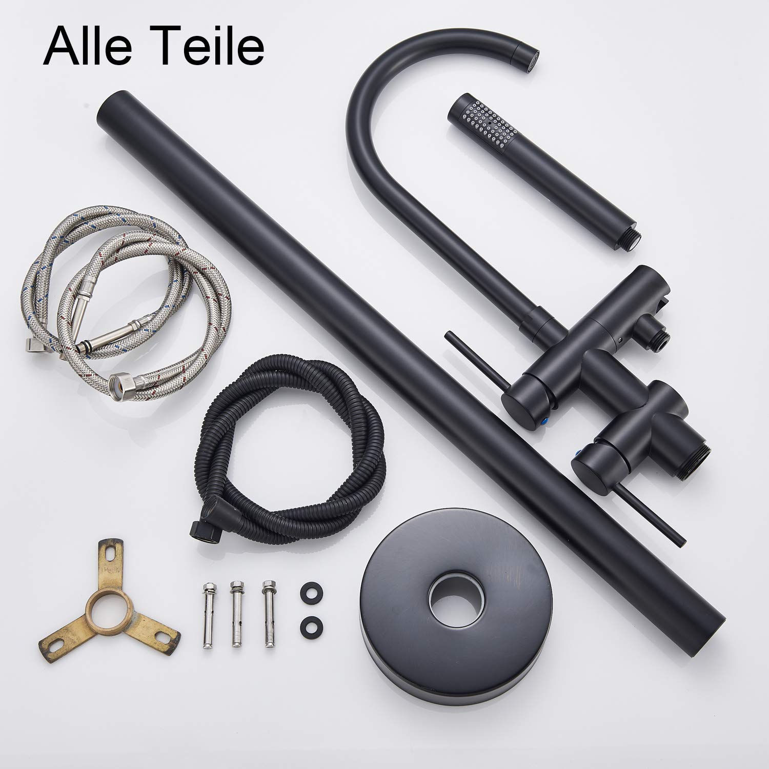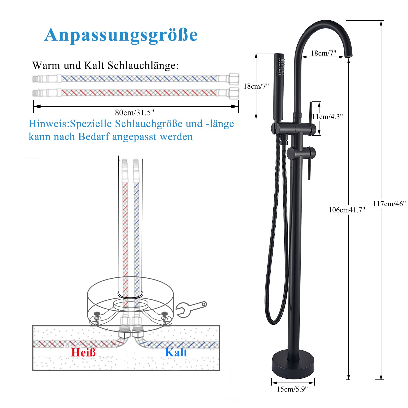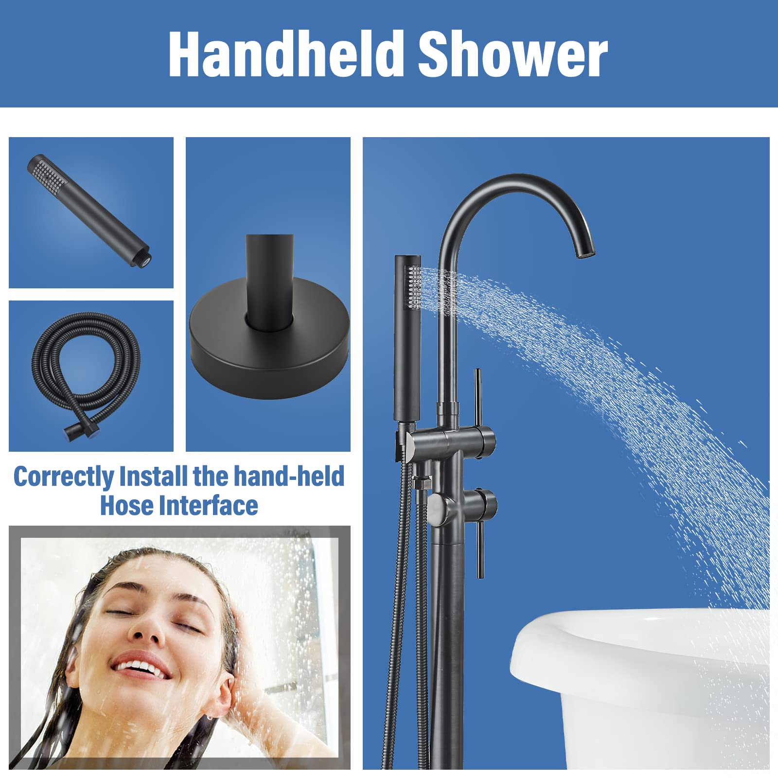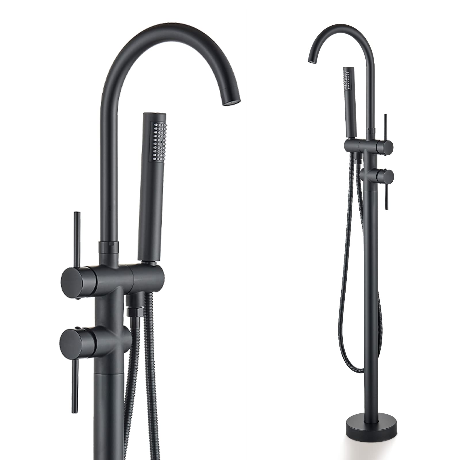 ["Elegance Design: This freestanding bathtub faucet is coated with a matte black finish, exuding a luxurious feel with its matte texture in black. The main components are made of high-quality stainless steel for long-lasting durability, and the sturdy base ensures a secure stand.","360° Rotating Water Spout: The faucet is equipped with a 360-degree rotating water spout, allowing you to adjust the direction of the water flow according to your personal preferences. If you don't need the bathtub spout, you can simply slide it to the side to create more space in the tub and make the bathing experience even more enjoyable.","Easy Handling: The two-handle design allows for easy temperature adjustment and switching between shower modes. The top diverter switches between 2 shower modes (bathtub spout and hand shower) for a personalized shower experience. The lower single handle mixer controls water temperature and flow, and the handle is easy to grip and operate.","Easy Installation: All installation parts are included, making the installation process easy. You can easily and securely install the bathtub faucet on the floor.","Attentive Service: If you have any questions, please contact us. We will do our best to assist you."]