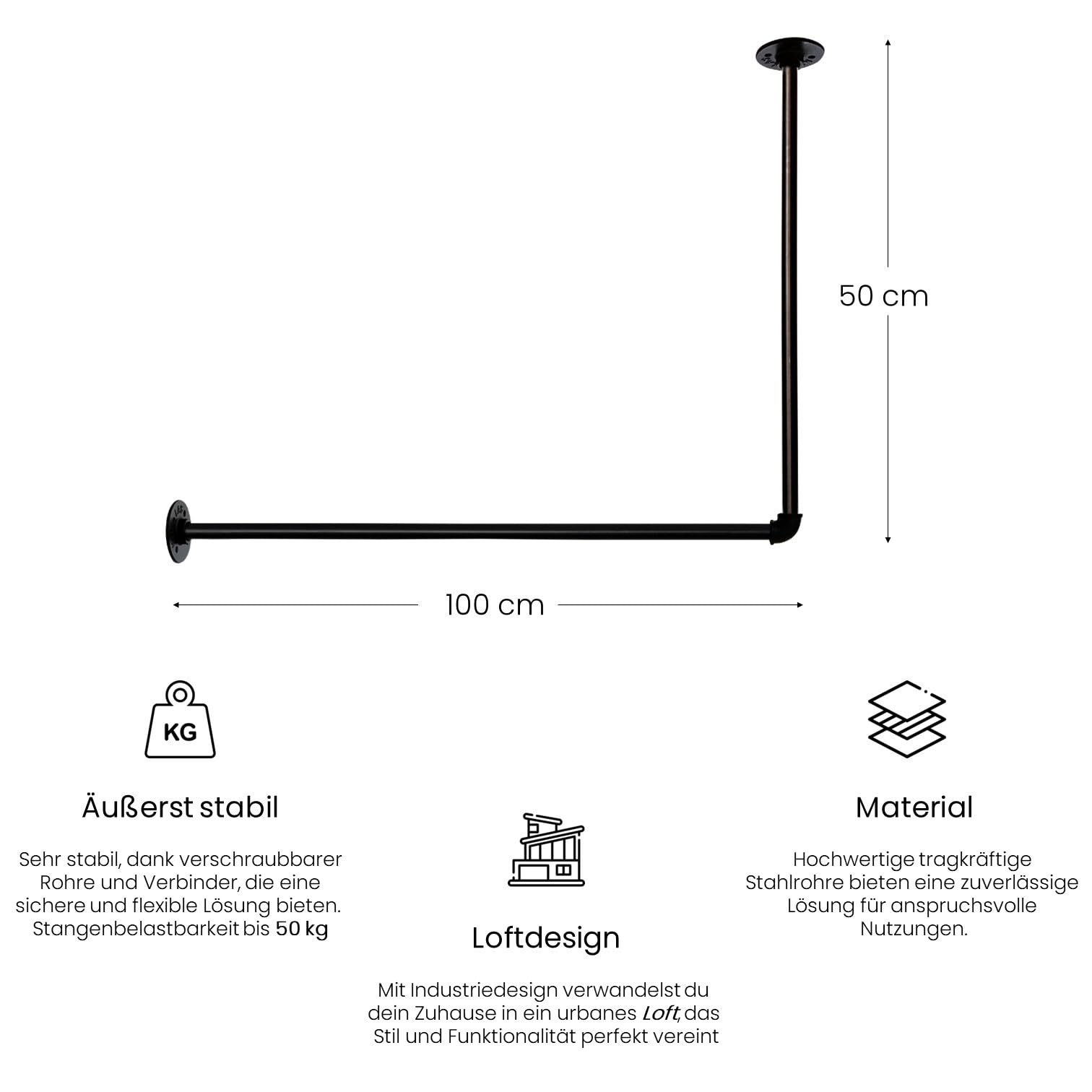 ["Dimensions ๐ธ Rod dimensions: Width 100 cm x Height 50 cm - Overall dimensions: including connectors and angles Width 102 cm x Height 55 cm - Material: Steel / Malleable iron - Color: black", "Versatile Industrial Style Design ๐ธ Our clothes rack made of sturdy 2.5 cm thick steel tubes with a thickness of 1.2mm and connectors is not only functional but also aesthetically pleasing. It is a perfect addition to your interior design, combining robust tube frame with simple elegance and urban style in a unique way.", "Aesthetic and Contemporary ๐ธ The timeless design of the clothes rack creates a modern atmosphere. It blends harmoniously into any room, bringing simple elegance with an urban touch.", "Functionality meets Aesthetics ๐ธ The Industrial Design clothes rack is not just an aesthetic piece but also highly functional. In the hallway, it allows for neat storage of jackets and coats, while in the bedroom, it stylishly showcases your favorite pieces.", "Easy Assembly ๐ธ Assembly is easy and straightforward, as all necessary mounting hardware including assembly instructions are included in the package."]