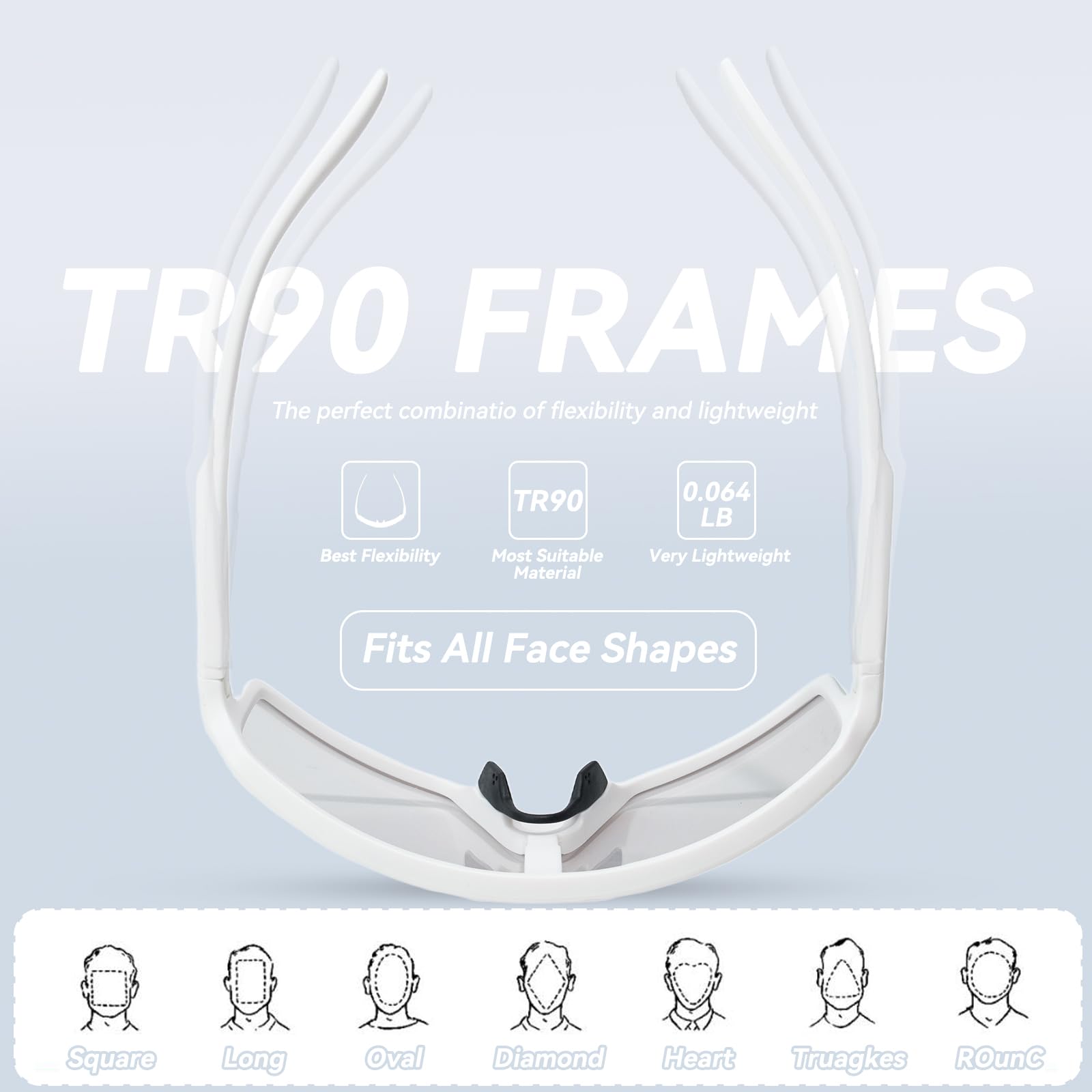["【UV400+ SMART DOUBLE PROTECTION】Optically high-quality PC lenses with UV400 nanocoating, double filtering of 100% harmful UV rays. The anti-oil coating on the lens surface reduces glare disturbances, true color reproduction, reduces visual fatigue, and provides a clearer and more stable vision while cycling.","【PHOTOCHROMIC SPORTS GLASSES】The light-sensitive lens automatically adjusts light transmittance to light intensity (15%-85%), transforming into a dark gray lens in a second on sunny days and restoring the transparent state on cloudy days. All-weather adaptation to bright and dark changes for optimal visual comfort.","【ERGONOMIC PANORAMIC DESIGN】Full-frame design with TR90 memory frame, extra wide curved lens expands the field of view by 30%, eliminates blind spots. Aerodynamic curved structure reduces wind resistance, multilayer sealing strips effectively block wind and sand splashes, protecting your eyes from strong impacts.","【ZERO PRESSURE MOTION SYSTEM】High elastic liquid silicone nose pad, adaptable to various face shapes. Ultra-lightweight 30g body with micro-textured non-slip ear socks, passes 72 hours of salt spray test, no shifting during strenuous exercise. Impact-resistant lenses with CE certification, professional eye protection safety.","【FULL SCENE SPORTS ADAPTATION】Applicable to 20+ sports such as road cycling, mountain speedway, skiing, marathon, etc. TR90 material is resistant to -20°C low temperature. Optional frames are available for nearsighted individuals, comes with a storage hard shell case packaging suitable as a thoughtful gift for sports enthusiasts."]