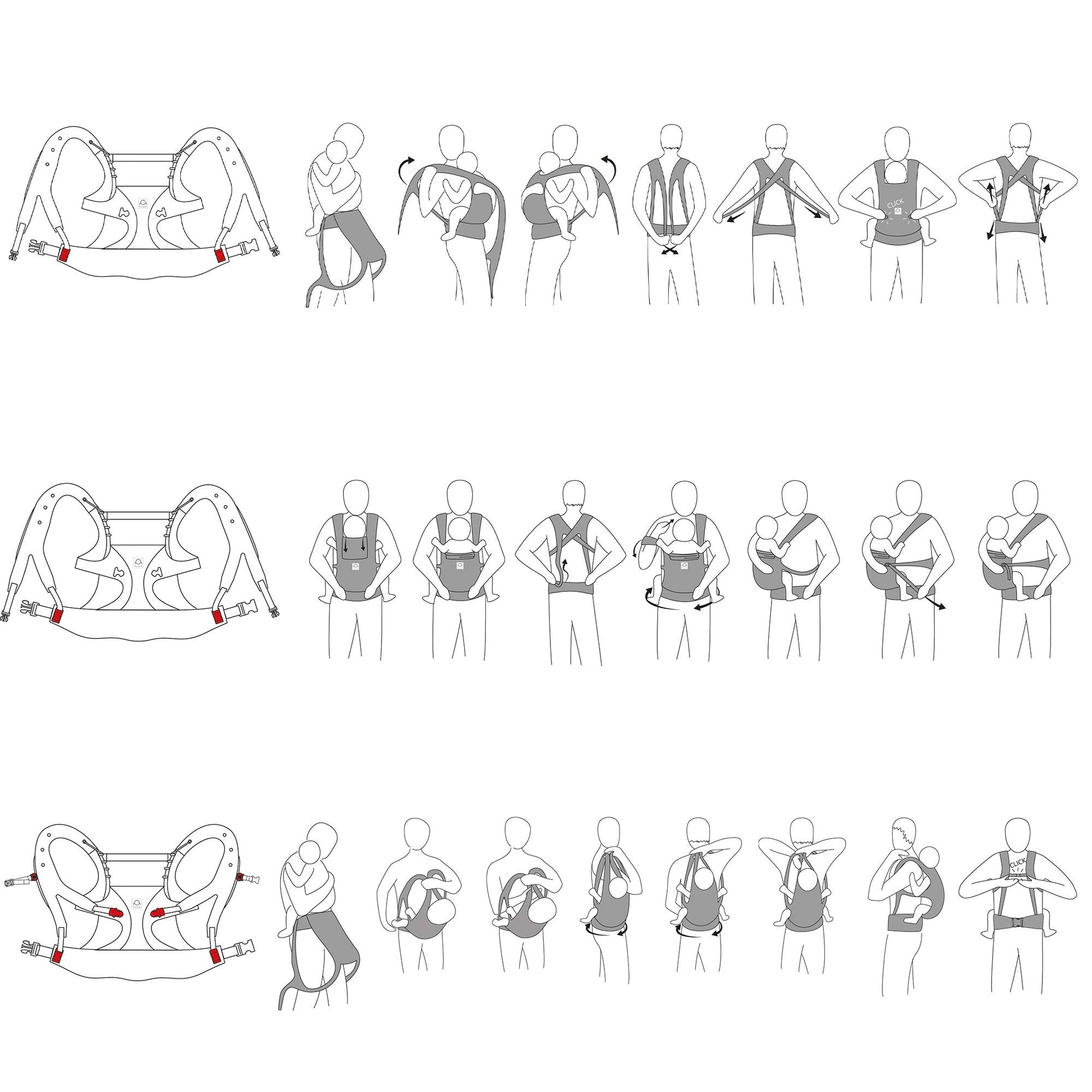 "Suitable from birth for babies from around size 50/56 cm and toddlers up to around size 98, from 3.5 kg to 20 kg. You can carry your baby facing you on the front, on the side, and on your back. The flat, padded shoulder straps are split, running parallel and crossing at the same time. This optimizes weight distribution, makes it easier to put on the carrier, and allows you to wear the shoulder straps either straight like a hiking backpack with a chest strap or crossed on the back. This means relief for your back and comfortable wearing even under a jacket or an additional backpack. The continuous growth of the back panel in height and the seat area in width allows you to adjust the carrier optimally to the size of your child. Simply fasten three buckles and tighten them accordingly, and you can carry it safely and comfortably. Rolled up and stored inside itself, the Ruckeli carrier with its wide waist belt forms a practical hip seat when your carrier has become an explorer and wants to hop on and off. Made from 100% organic cotton and a separately washable diaper area."