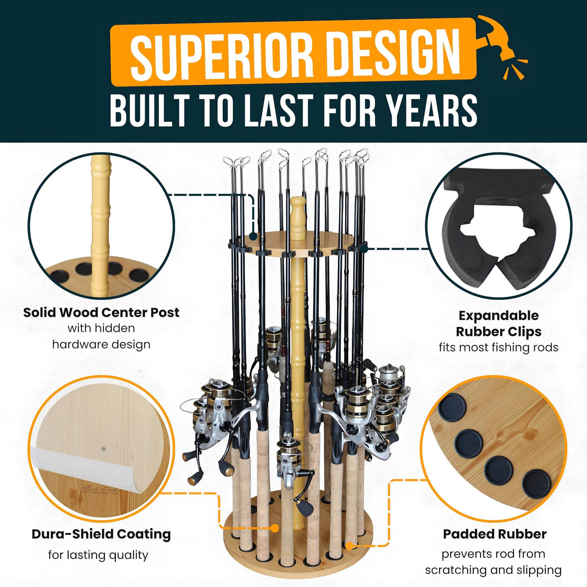 ["Storage and Organization: The Rush Creek Fishing Rod Holder accommodates up to 16 fishing rods, poles, and reels, keeping them neatly organized and securely in place; perfect for your garage, outdoor spaces, sheds, boats - and any of your fishing adventures.","Sturdy Construction: The solid wood center post of this fishing rod holder is carefully crafted, making it extra sturdy and reliable; provides long-term storage for your fishing gear - like fishing rods, fishing poles, accessories, and tackle boxes.","Space-Saving Design: This fishing rod holder has a diameter of 13.5 inches, is durable and lightweight, making it easy to maneuver even with all your fishing gear, such as fishing rods and tackle boxes; its vertical design reduces clutter and creates floor space.","Easy Sweat-Free Installation: This fishing rod holder and storage offer a tool-free mounting solution for all your fishing gear - including fishing rods, fishing poles, accessories, and tackle boxes; keep your fishing gear organized with hassle-free setup.","Versatility: This fishing rod holder is suitable for both freshwater and saltwater fishing rods / poles and ideal for indoor and outdoor storage, it is also compatible with a variety of rod types - such as ice, surf, spinning, casting, fly rods."]