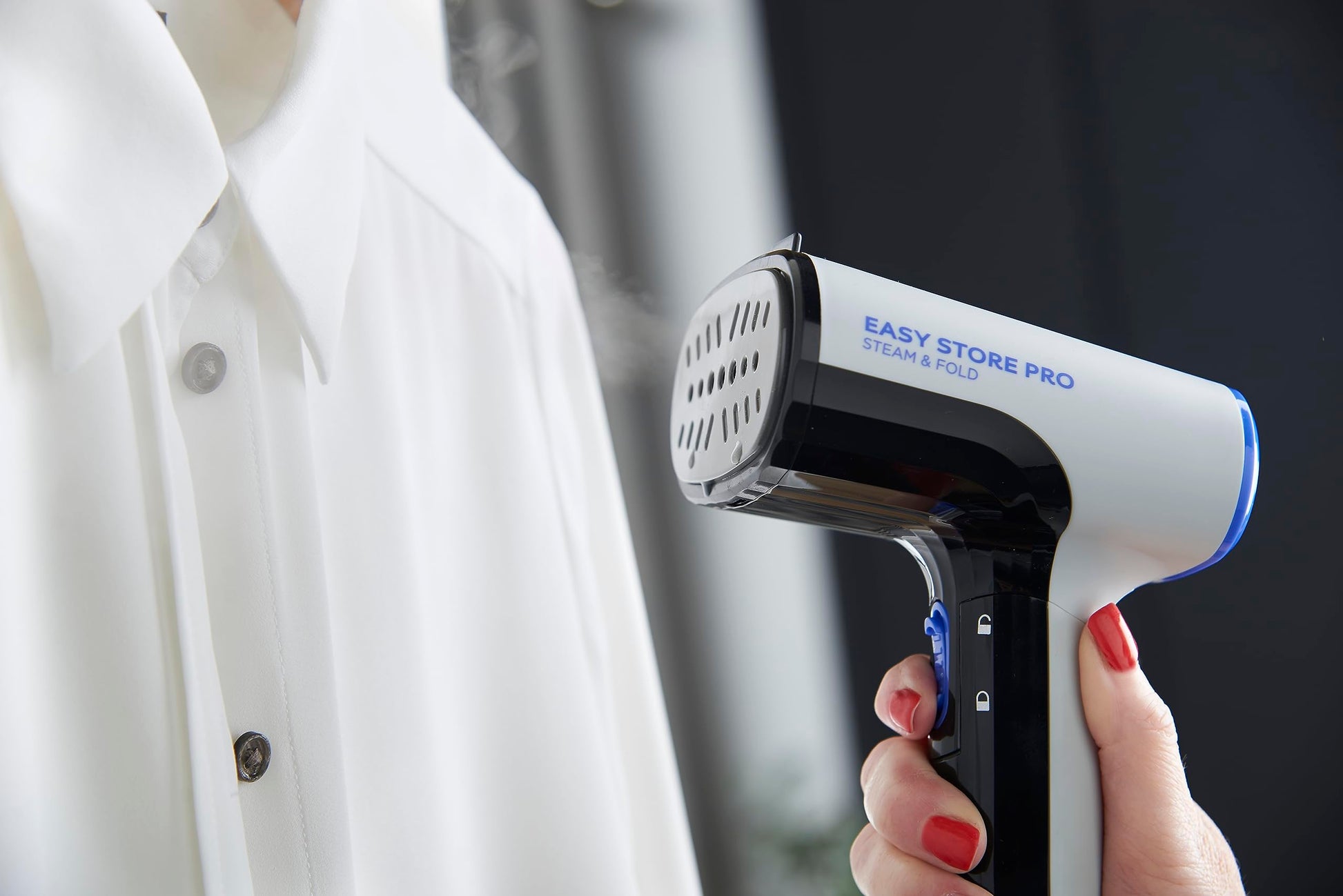 ["Foldable steam brush, compact design and perfect travel companion","Powerful 20 g/min steam output, 150ml water tank, 8 minutes of steam time","Ready to steam in just 45 seconds, no ironing board required, automatic safety shut-off after 15 minutes, indicator light","Fabric attachment for refreshing clothes and textiles at home or on the go, 3m long power cord with cable wrap and clip for attachment","Kills up to 99.9% of bacteria in 60 seconds* (*tested on 2 types of bacteria on 3 surfaces in the lab, more information on our website)"]