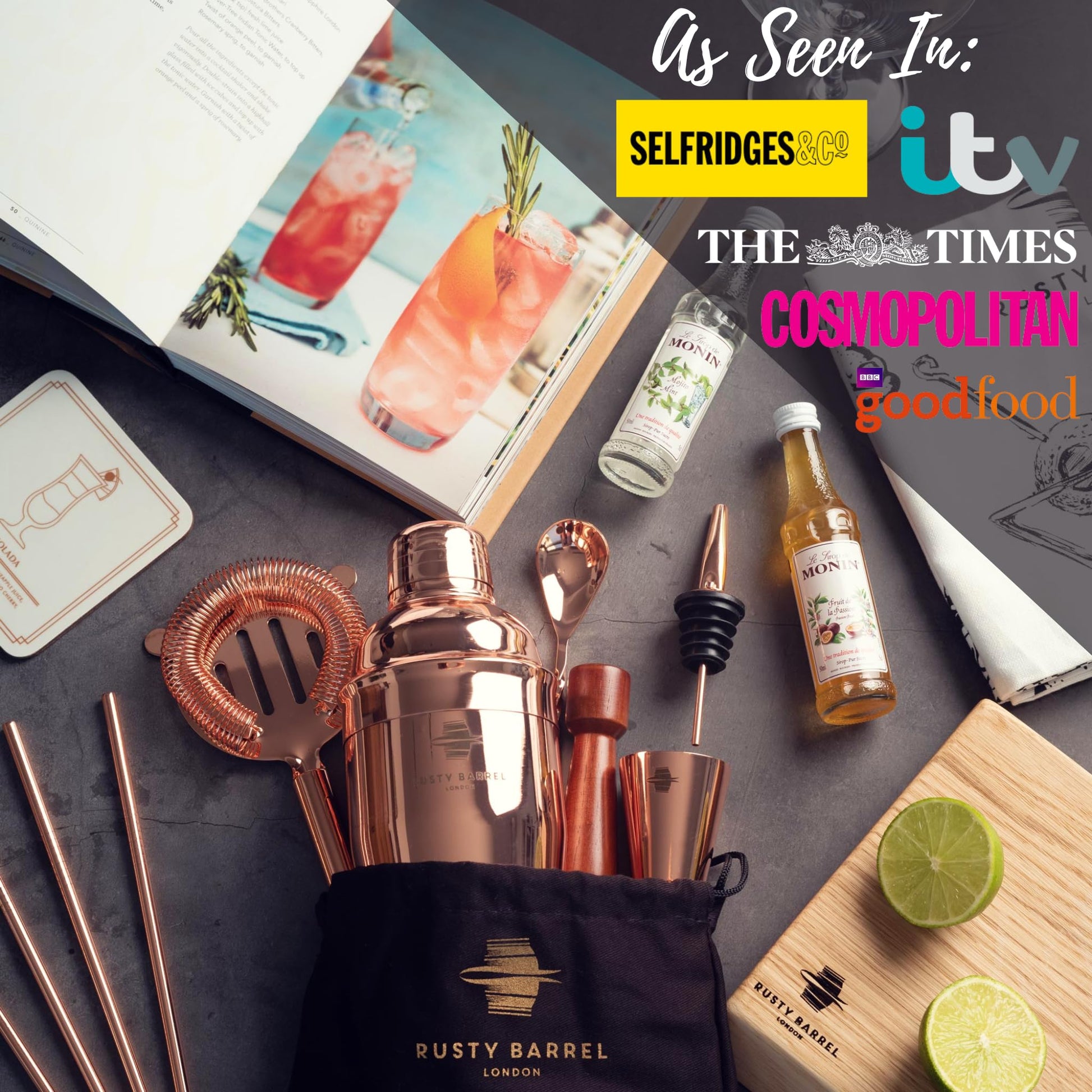 ["Ingredients - Our Rusty Barrel Chelsea Bartender Set with Bar Accessories includes a red-gold Manhattan Cocktail Shaker with 24 oz capacity, a wooden muddler, a double-sided Cocktail Measuring Jigger with 0.85 oz and 1.7 oz capacity, a pourer, a bar spoon, a bag, a bar strainer, and the recipe book "12 Classic Cocktails" (in English). It includes everything you need to get your party started!", "High-Quality - Our Chelsea Cocktail Mix Set not only looks elegant and professional, but it is also crafted to last a lifetime. The bar accessories are made from high-quality, sturdy stainless steel with a mirrored finish. Designed to prevent any leaks or rusting, it will be a part of your home bar for many years to come.", "A Perfect Gift - We at Rusty Barrel believe that quality is essential. Our cocktail set comes in a luxurious and stylish gift box, making it an ideal gift idea for anyone. It is perfect for occasions like Christmas, birthdays, anniversaries, or as party accessories for a summer garden party!", "Make Cocktails at Home - Our Bar Set includes cocktail accessories with all the tools you need to prepare drinks like a pro. Whether you are just starting out or are already an experienced bartender, it has never been easier to impress and delight with impressive and delicious cocktails. With the cocktail shaker and recipes in our cocktail book, you can impress your family and friends with classics like a Mojito, Cosmopolitan, or a Piña Colada."]