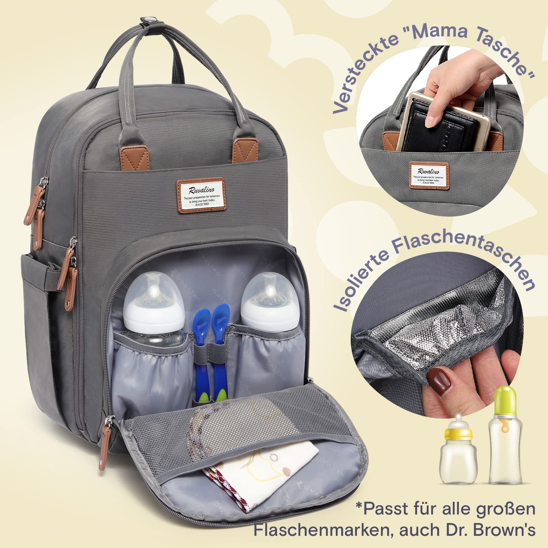 Practical design - With the extra wide opening, this baby diaper backpack makes it easy to find important items, and the two zippers of this baby backpack can also be easily opened and closed with one hand! The ergonomic handle and thick padded shoulder straps allow for comfortable carrying and provide powerful reinforcement.