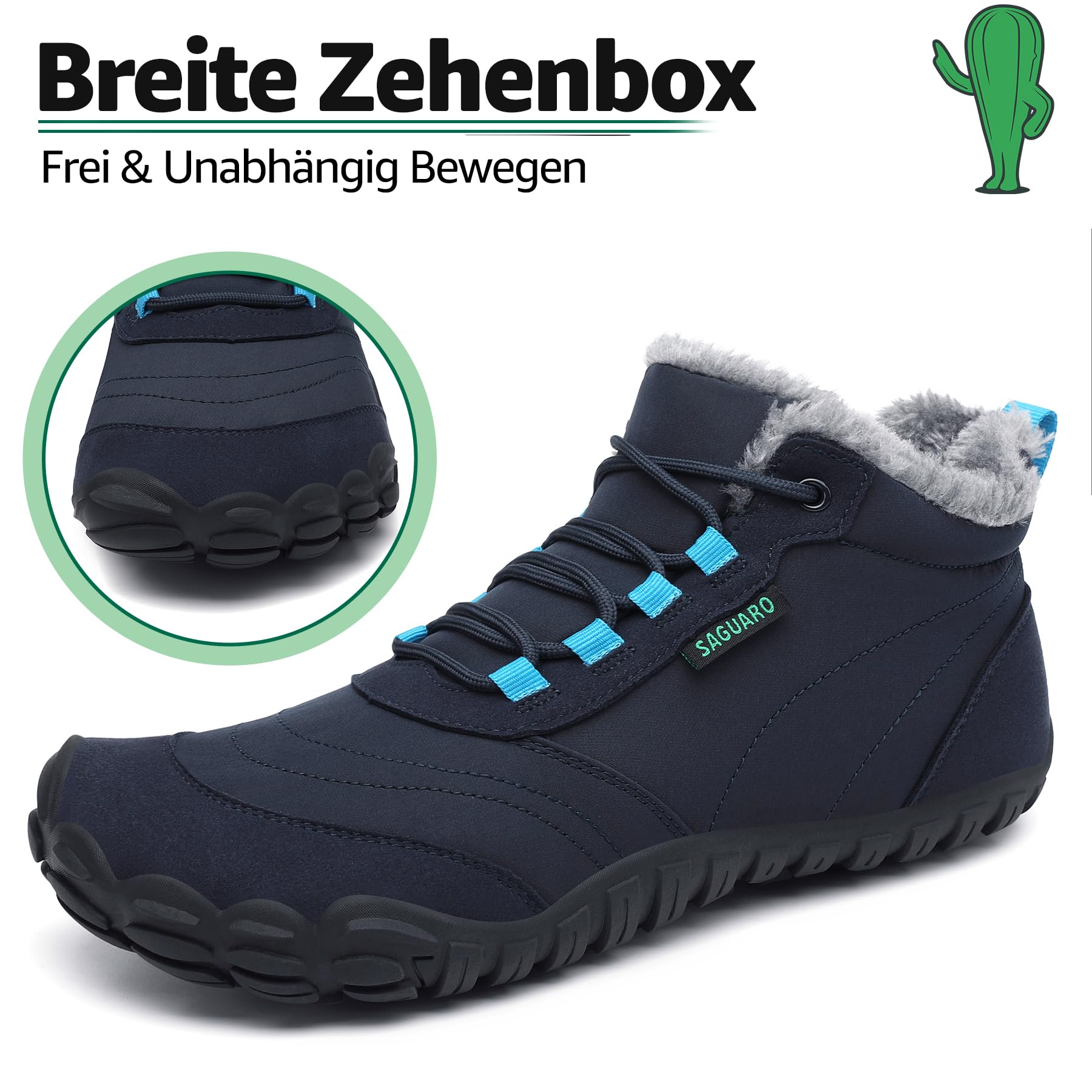 ["Plush lining: Winter barefoot shoes with skin-friendly, soft plush lining provide excellent warmth insulation, block cold air, and create a warm environment for the feet. The high-top design encloses the ankle and protects against cold wind","Wide and Comfort Toe: The wide toe design of SAGUARO barefoot winter shoes provides enough space for each toe, effectively adjusts foot posture, provides support, and enhances foot sole sensation, perfectly matching the advantage of \"The 5 toes do not stick together and can move freely\"","Graphene thermal insole: The upgraded graphene thermal insole efficiently retains heat, stays warm for a long time, and stays securely thanks to the EVA short plush design, without slipping. Removable and easy to clean. Upper made of windproof, durable Oxford fabric and microfiber with faux fur enhances insulation","Unencumbered zero-drop sole: The soft zero-drop sole adapts to foot flexion and muscle movements, providing excellent grip and stability; the non-slip and abrasion-resistant rubber sole ensures stable footing on slippery surfaces and effectively prevents slipping and falls","Sustainable packaging: Each pair of winter barefoot shoes comes in a reusable, eco-friendly fleece bag. Lightweight, durable, and convenient for storage and transport – ideal for daily commutes, walks, and outdoor hikes"]