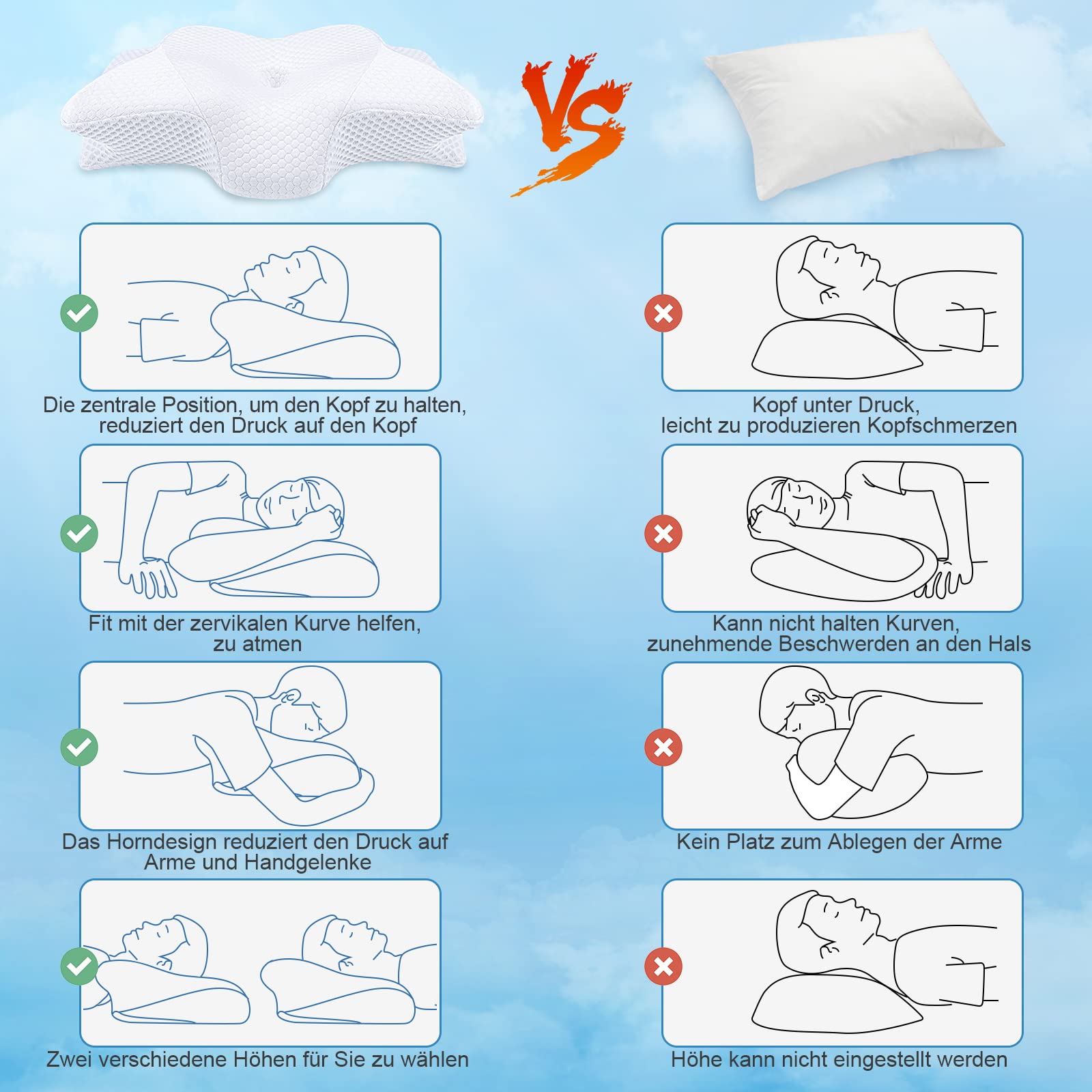 ["✅ 【Ergonomic Neck Support Pillow】Our orthopedic pillow is different from ordinary pillows. Our neck support pillows are designed according to the curves of the human body. The height and curvature of the ergonomic neck support pillow perfectly fit your shoulders and neck, and the vertebrae in the middle of the pillow reduce pressure on your ears when sleeping on your side.","✅ 【Comfortable High Quality Memory Foam Pillow】Our side sleeper pillow core is made of memory foam, which is soft and elastic. At the same time, the memory foam provides excellent support, allowing your body to be in a comfortable curve.","✅ 【Optimal Size】Our side sleeper pillow height 3.9inches-5.1inches, pillow size: 23.7 x 14 x 3.9/5.1inches. The pillow is suitable for most people. You can rely on the size information to choose the right pillow for you.","✅ 【Breathable, Skin-friendly Pillow Cover】This neck support pillow cover is made of ultra-comfortable, breathable cotton fabric, making you feel soft and cozy. This neck pillow cover is removable and machine washable, so you can keep it clean and fresh at all times.","✅ 【Easy Cleaning】The orthopedic neck pillow is easy to clean, you just need to remove the pillow cover and put it in the washing machine. The pillow core does not need to be washed, as it is made of high quality memory foam and cannot be washed."]