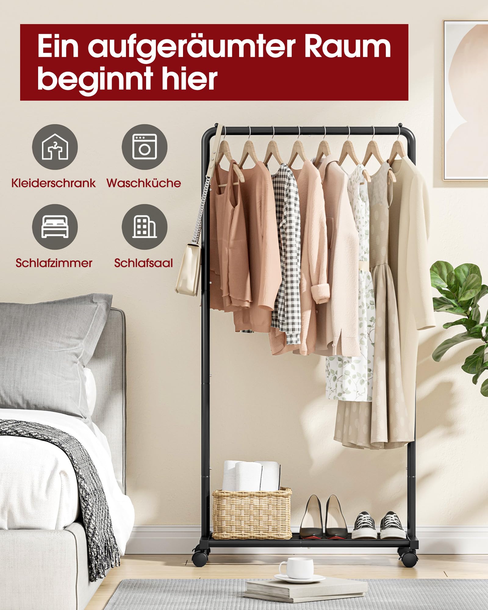 VERSATILE APPLICATION: With compact dimensions of 73 x 37.5 x 150 cm, the modern and elegant Sakugi clothes rack with wheels is the perfect choice for various rooms and interior styles. It is perfect for bedrooms, closets, laundry rooms, or offices, providing practical storage space for your clothing."
