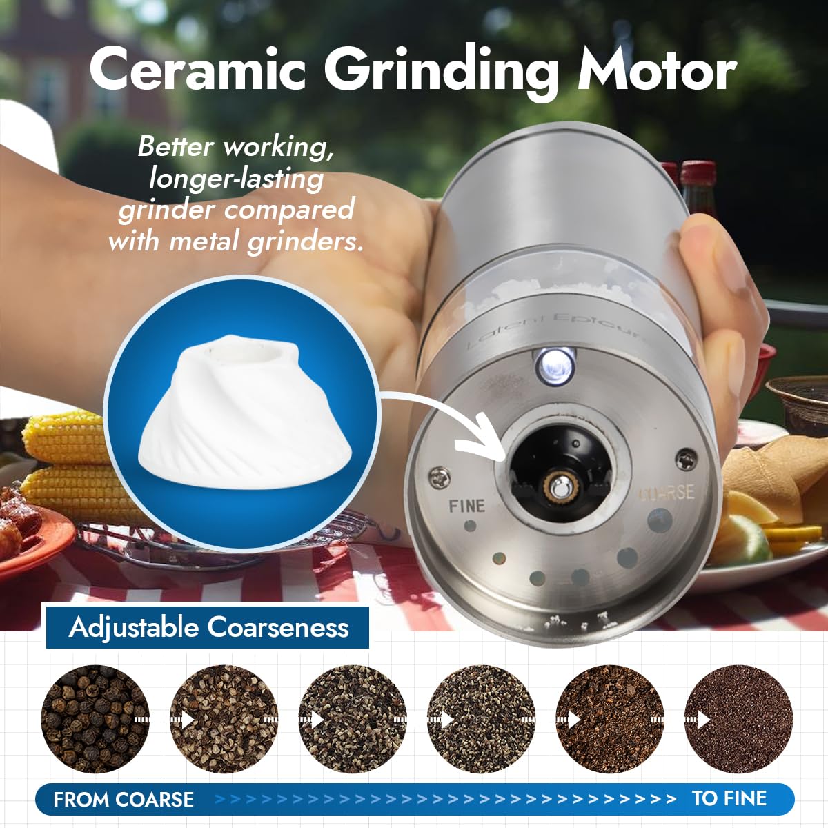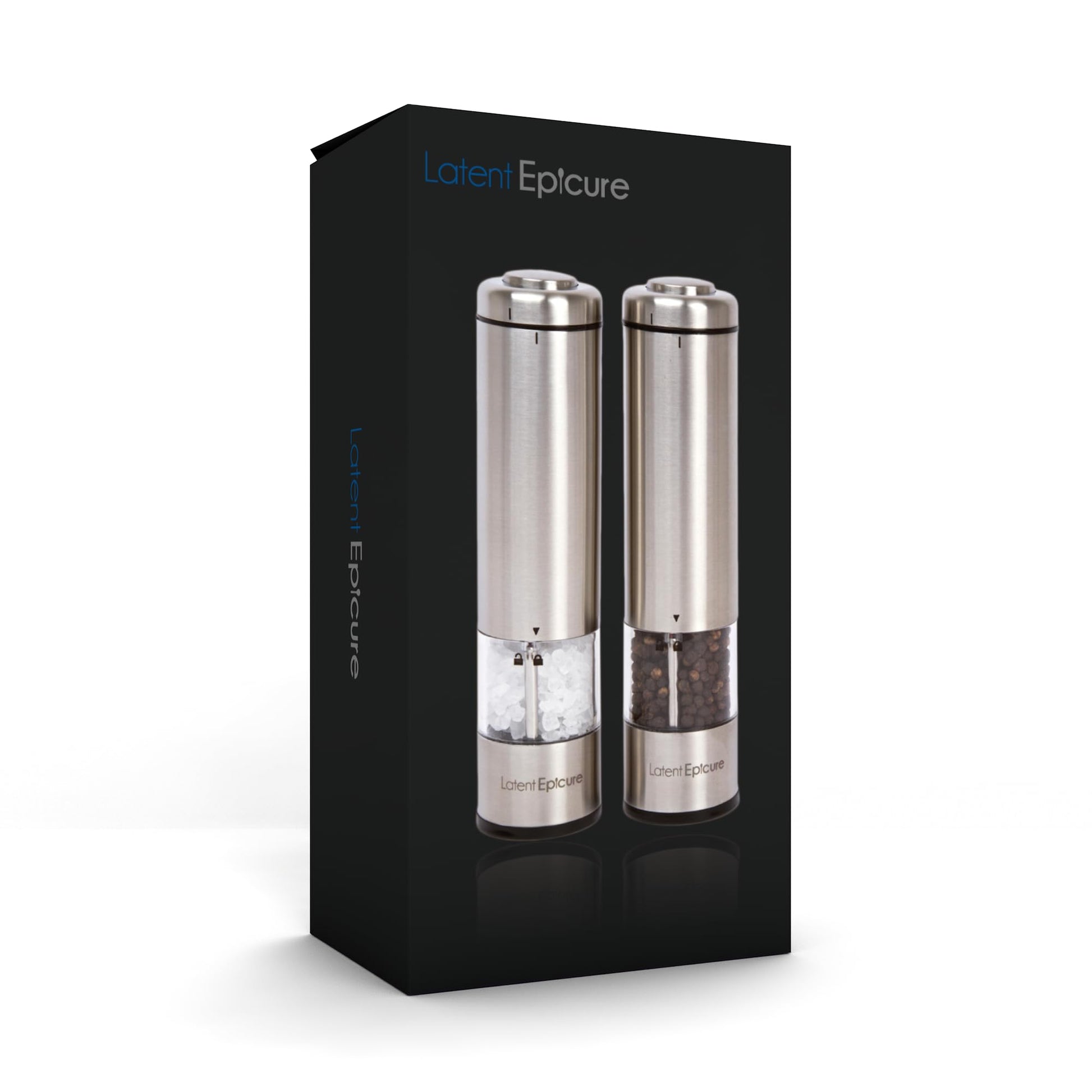["Clean kitchen surfaces - Our free acrylic mill stand helps keep your kitchen surfaces clean and free from salt and pepper residues", "One-button operation - With just one press, your desired spice is automatically ground", "Easy adjustment of coarseness - Fine or coarse? Easily adjusted with a button", "No over-seasoning - The integrated LED light shows you exactly where the spice is being distributed", "Not imported goods - The products offered by Latent Epicure via Amazon are shipped from or within Germany."]