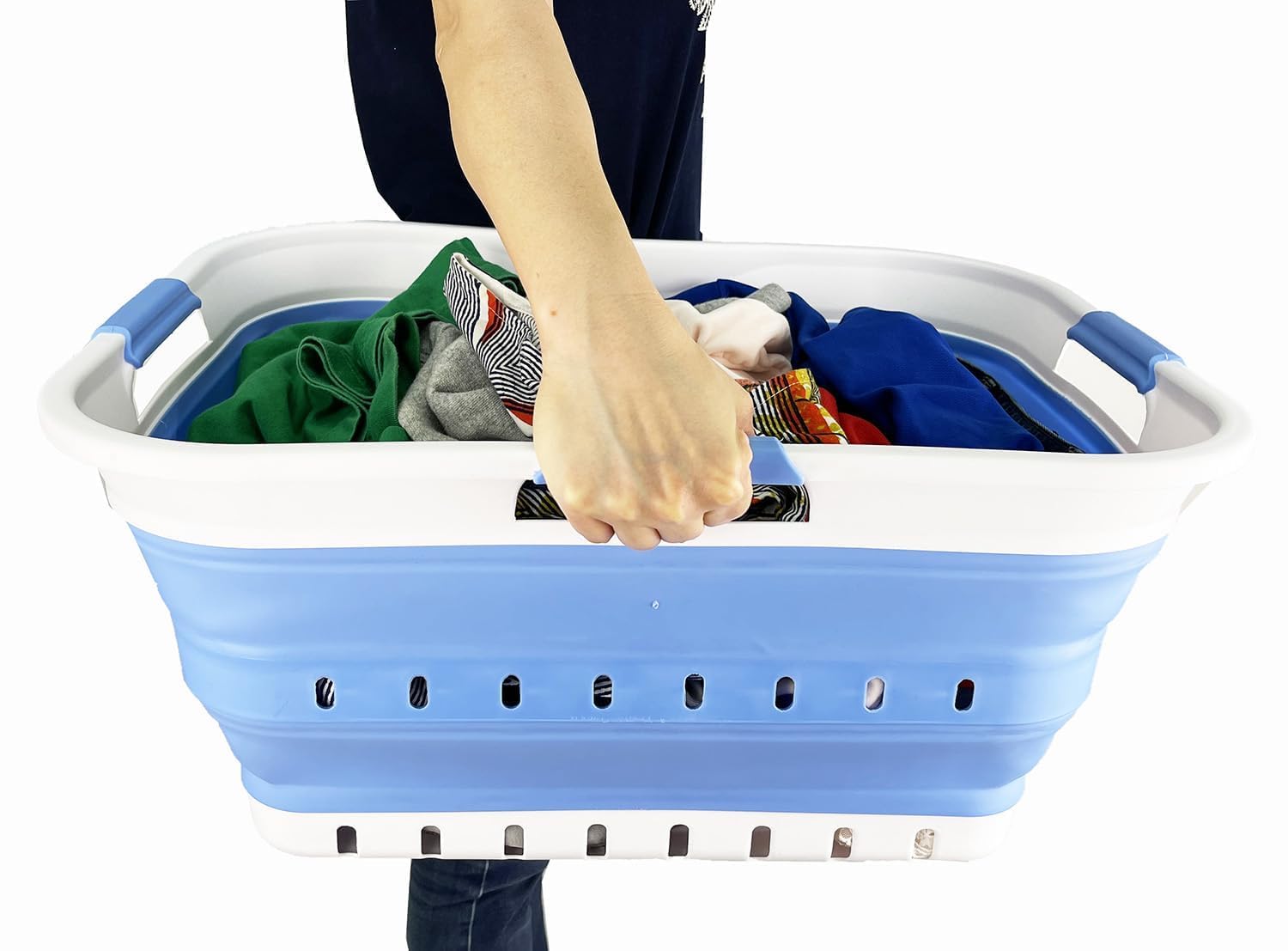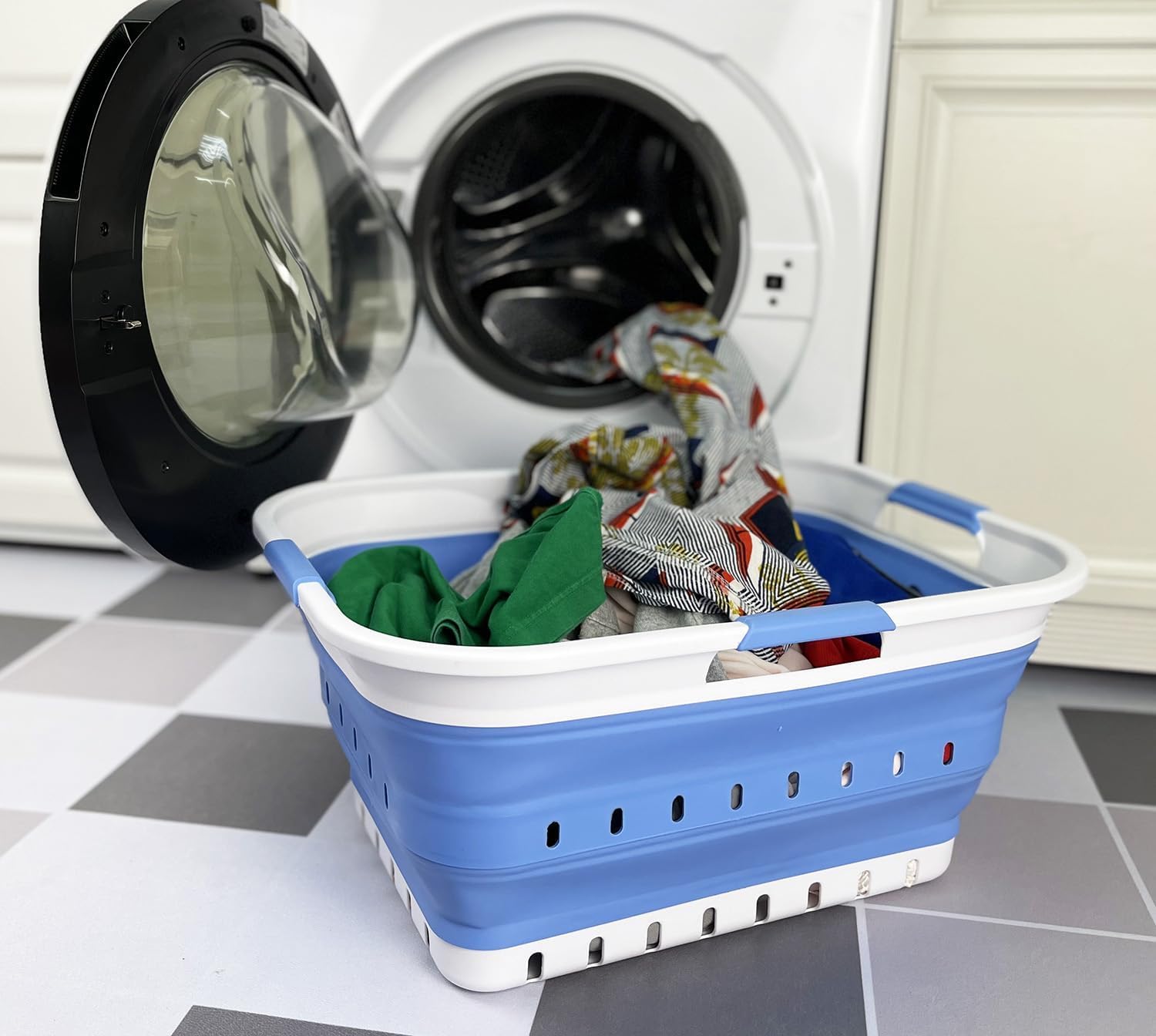 SAMMART 42L Plastic Foldable Laundry Basket - Foldable Pop-Up Storage Container/Organizer - Portable Laundry Hamper - Space-saving (1, White/Little Boy Blue)