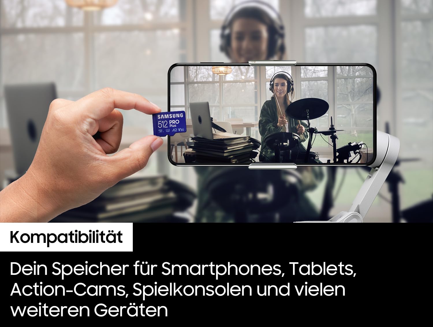 Samsung PRO Plus microSD card + SD adapter, 256GB, for mobile gaming on smartphones, tablets, and handheld consoles. UHS-I U3, Full HD & 4K UHD, 180MB/s read, 130MB/s write. Model: MB-MD256SA/EU.