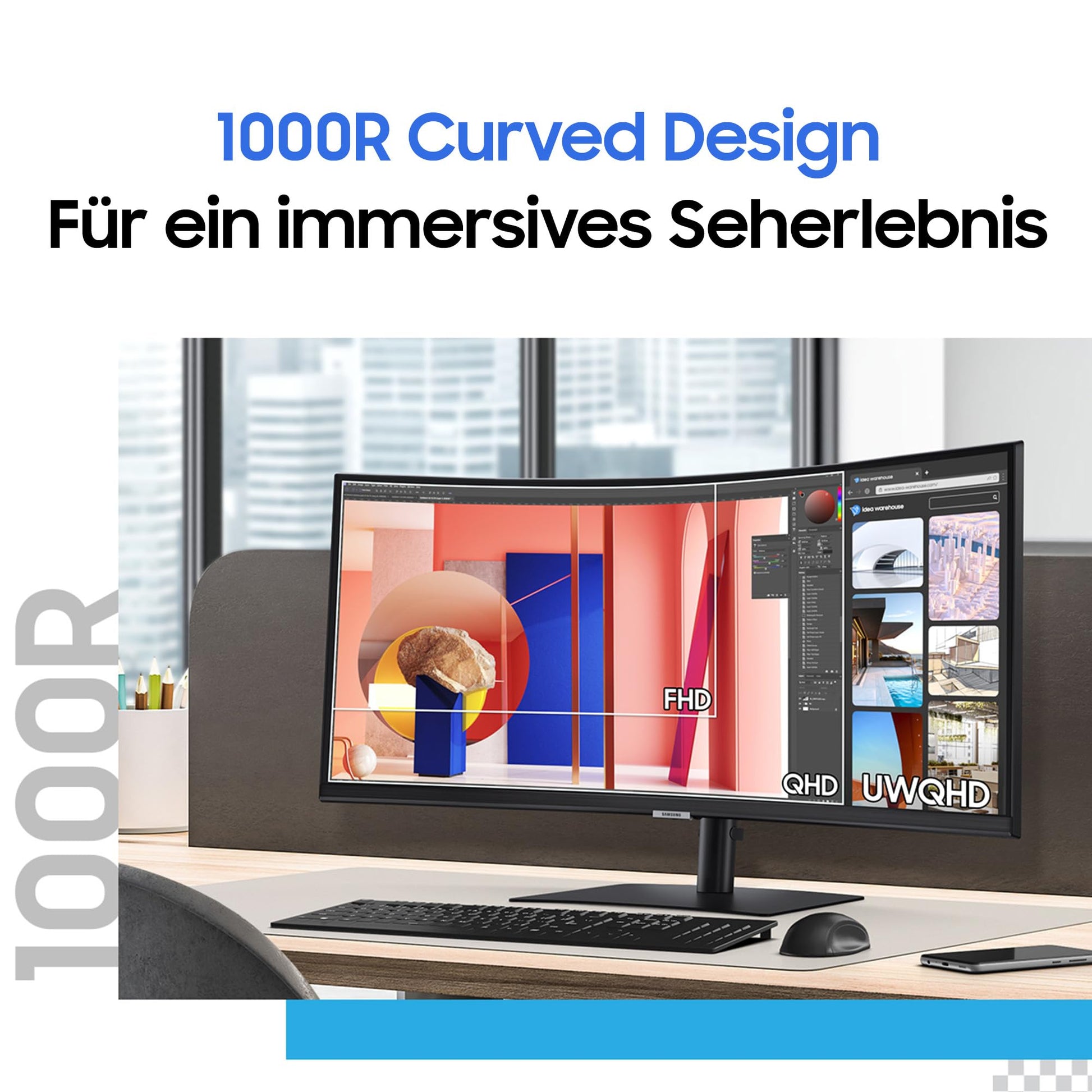 "Detailed representation, vivid images with vibrant colors: Samsung monitor with VA panel with a resolution of 3440 x 1440 pixels, HDR10, 350 nits brightness, and 3000:1 contrast ratio. Smooth, fluid images: 100 Hz refresh rate and 5 ms response time for seamless image reproduction without stuttering and distortions. Eye Saver mode and Flicker Free technology for reduced blue light emissions and screen flicker - relaxed eyes even with prolonged use. Ergonomic working thanks to height adjustment. High compatibility and quick connectivity with numerous connections - whether PC or laptop: 1 x HDMI, 1 x DisplayPort, 1 x USB-C (90W), 3 x USB 3.0 (Hub), 1 x Ethernet (LAN), 1 x headphone. Package contents: 1 x Samsung ViewFinity S65VC Curved Monitor 34 inches, 1.5m power cable, 1 x HDMI cable, 1 x DisplayPort cable, 1 x USB-C cable, 1 x USB cable, LS34C652VAUXEN"