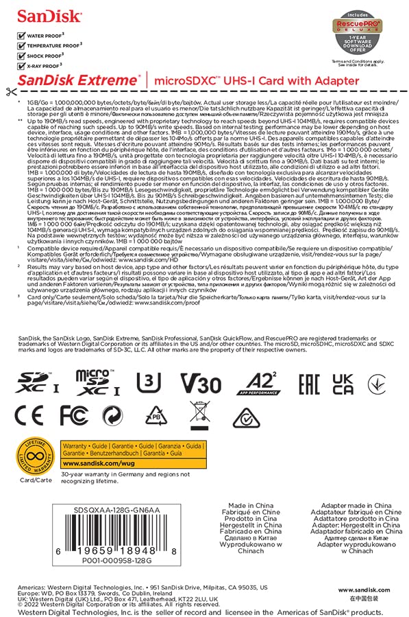 "The SanDisk Extreme microSD memory card is ideal for action cams and drones; With 4K UHD, you are right in the action and experience the adrenaline rush over and over again. A read speed of up to 190 MB/s and write speed of up to 90 MB/s allows for fast file transfers thanks to SanDisk QuickFlow technology. When combined with the SanDisk PROFESSIONAL PRO-READER for SD and microSD cards, you can achieve maximum speed (sold separately). Tested under extreme conditions; temperature resistant, waterproof, X-ray proof, and shockproof. Includes: SanDisk Extreme microSDXC UHS-I memory card 128GB for action cams and drones + adapter + RescuePRO Deluxe (up to 190 MB/s, A2, Class 10, U3, V30) 30 years warranty"
