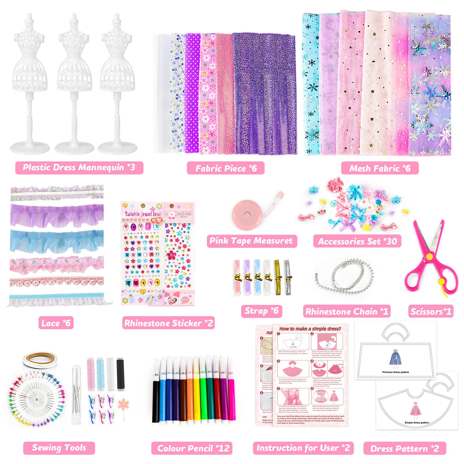 ["Fashion Designer Kit for Girls Includes comfortable fabric and safe sewing tools, 3 mannequins, 2 sewing patterns, glittering trims, and more.",