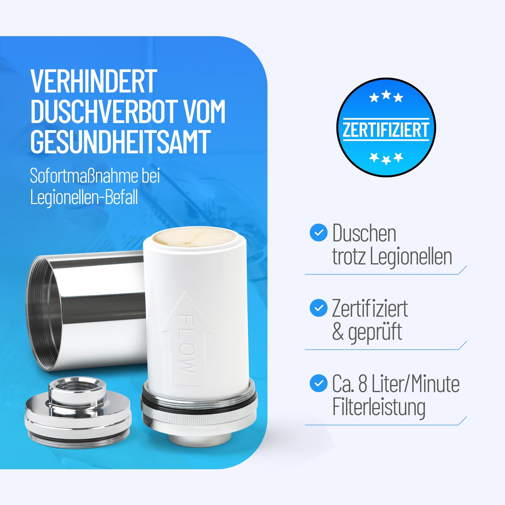 ["✅ CERTIFIED LEGIONELLA FILTER: Safe instant protection against Legionella, Pseudomonas, E.Coli, and other microorganisms through exceptionally fine filter pores (0.2µm) guaranteed",